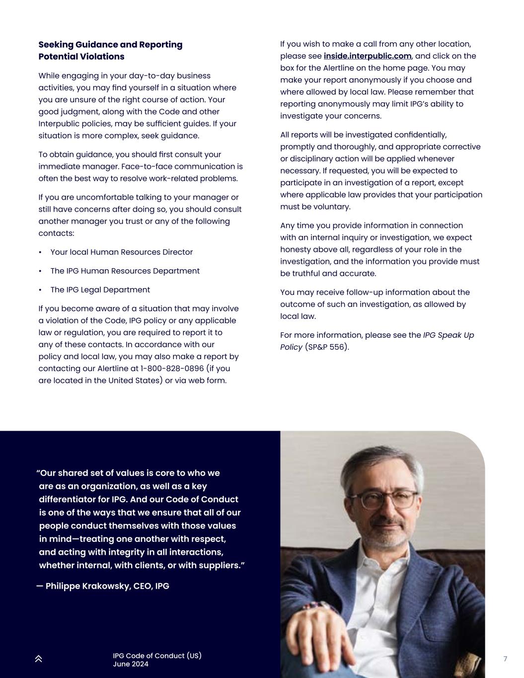 6IPG行为准则(美国)2024年6月寻求指导和报告潜在违规行为IPG促进随时公开沟通,并鼓励员工在需要进一步澄清准则中的原则和政策以确保合规的情况下寻求指导。