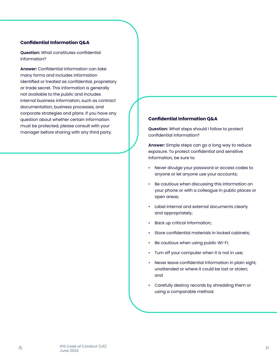 21IPG行为准则(美国)2024年6月机密信息问答提问:什么构成机密信息?答:机密信息可以有多种形式,包括被认定或被视为机密、专有或商业秘密的信息。这些信息一般不向公众提供,包括内部业务信息,例如合同文件、业务流程以及公司战略和计划。如果您对某些信息是否必须受到保护有任何疑问,请在与任何第三方分享之前咨询您的经理。保密信息问答题:保密信息保护应该遵循哪些步骤?答:简单的步骤可以大大减少接触。为保护机密和敏感信息,务必:•切勿向任何人泄露您的密码或访问代码,或让任何人使用您的账户;•在手机上或在公共场所或开放区域与同事讨论这些信息时要谨慎;•清晰、适当地标记内部和外部文件;•备份关键信息;•将机密材料存放在上锁的柜子中;•使用公共Wi-Fi时要谨慎;•不使用时将电脑关闭;•切勿将机密信息留在明处,无人看管或可能丢失或被盗的地方;•小心地通过粉碎记录或使用类似方法销毁记录。