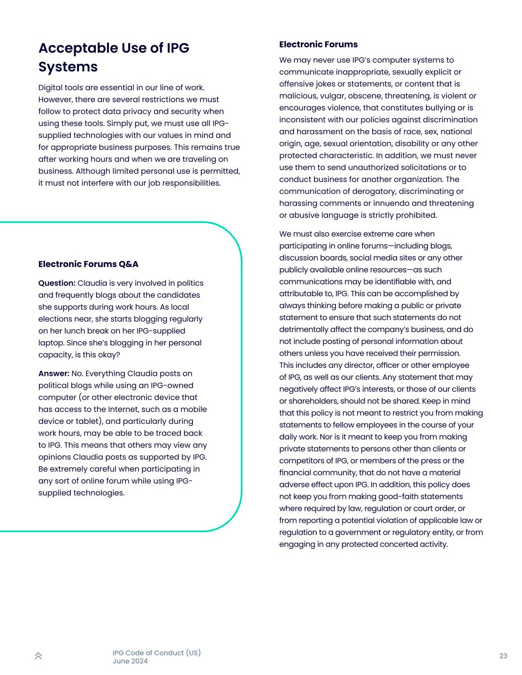 23IPG行为准则(美国)2024年6月可接受地使用IPG系统数字工具在我们的工作线中是必不可少的。然而,在使用这些工具时,为了保护数据隐私和安全,我们必须遵守几个限制。简单地说,我们必须在使用所有IPG提供的技术时牢记我们的价值观,并用于适当的商业目的。下班后和我们出差时,情况依然如此。虽然允许有限的个人使用,但绝不能干扰我们的工作职责。电子论坛我们不得使用IPG的计算机系统传播不适当的、露骨的色情或冒犯性的笑话或言论,或恶意、低俗、淫秽、威胁、暴力或鼓励暴力、构成欺凌或不符合我们反对基于种族、性别、国籍、年龄、性取向、残疾或任何其他受保护特征的歧视和骚扰的政策的内容。此外,绝不能利用它们发送未经授权的招揽或为其他组织开展业务。严禁传播贬损、歧视、骚扰言论或含沙射影、威胁性、辱骂性语言。在参加在线论坛——包括博客、讨论板、社交媒体网站或任何其他可公开获得的在线资源——时,我们也必须格外小心,因为此类通信可能可以识别并归属于IPG。这可以通过在公开或私下发表声明之前始终进行思考来实现,以确保此类声明不会对公司的业务产生不利影响,并且不包括发布有关他人的个人信息,除非你得到了他们的许可。这包括IPG的任何董事、高级职员或其他员工,以及我们的客户。任何可能对IPG的利益产生负面影响的声明,或我们的客户或股东的利益,都不应被分享。请记住,这项政策并不是要限制你在日常工作中向同事发表声明。也不意味着阻止您向除IPG的客户或竞争对手以外的其他人,或新闻界或金融界人士发表对IPG没有重大负面影响的私下声明。此外,本政策不会阻止您在法律、法规或法院命令要求的情况下做出善意陈述,或向政府或监管实体报告可能违反适用法律或法规的行为,或参与任何受保护的一致行动活动。电子论坛问答题:克劳迪娅非常参与政治,经常在工作时间写博客讲述她所支持的候选人。随着地方选举的临近,她开始在午休时间用IPG提供的笔记本电脑定期写博客。既然她是以个人身份写博客,这样可以吗?答:没有。克劳迪娅在使用IPG拥有的电脑(或其他可以上网的电子设备,例如移动设备或平板电脑)时,尤其是在工作时间,在政治博客上发布的所有内容,或许都可以追溯到IPG。这意味着,其他人可能会将Claudia发布的任何观点视为得到IPG支持。在使用IPG提供的技术的同时,参加任何类型的在线论坛时都要格外小心。