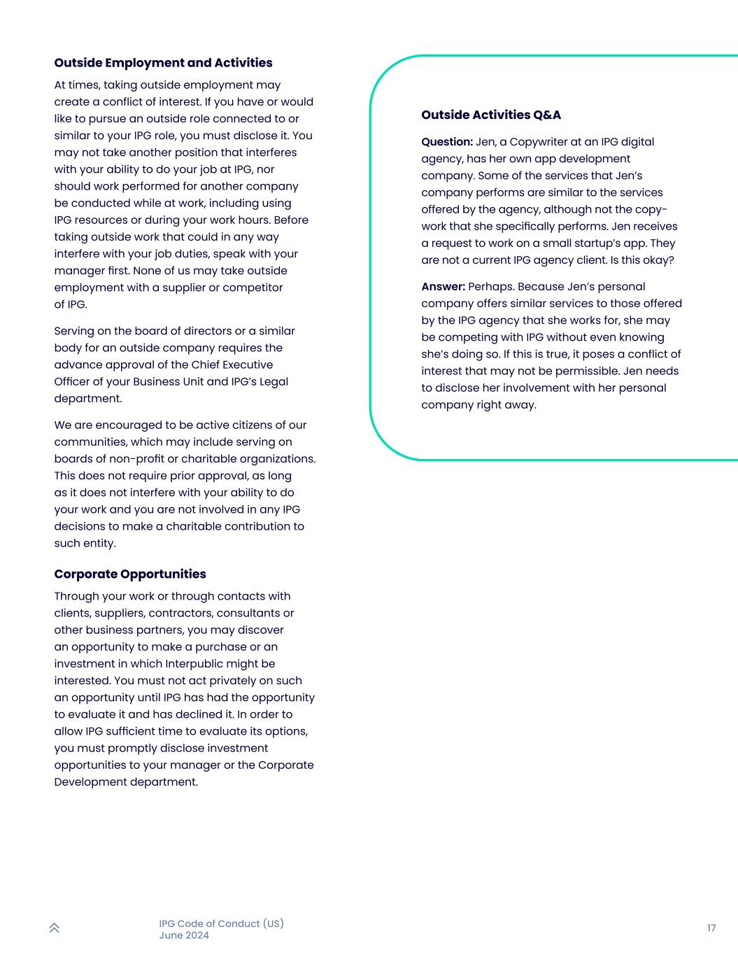 17IPG行为准则(美国)2024年6月外部就业和活动有时,采取外部就业可能会产生利益冲突。如果您已经或想从事与您的IPG角色相关或类似的外部角色,您必须披露。不得担任其他干扰其在IPG工作能力的职务,也不应在工作期间,包括使用IPG资源或在您的工作时间内,为其他公司履行的工作进行。在从事可能以任何方式干扰你的工作职责的外部工作之前,先和你的经理谈谈。我们任何人都不得在IPG的供应商或竞争对手处从事外部工作。为外部公司在董事会或类似机构任职需要事先获得贵公司业务部门首席执行官和IPG法务部的批准。我们被鼓励成为我们社区的积极公民,这可能包括在非营利或慈善组织的董事会任职。这不需要事先批准,只要它不干扰你的工作能力并且你没有参与任何IPG决策来对这类实体进行慈善捐款。企业机会通过您的工作或通过与客户、供应商、承包商、顾问或其他商业伙伴的联系,您可能会发现一个机会,可以进行Interpublic可能感兴趣的购买或投资。在IPG有机会评估并婉拒之前,不得私下对此种机会采取行动。为了让IPG有足够的时间来评估其选择,您必须及时向您的经理或企业发展部披露投资机会。号外活动问答题:Jen,某IPG数字代理商的文案撰稿人,有自己的APP开发公司。Jen的公司执行的一些服务与该机构提供的服务类似,尽管不是她具体执行的复制工作。Jen收到了在一家小型初创公司的应用程序上工作的请求。它们不是当前的IPG代销客户。这样可以吗?答:也许吧。因为Jen的个人公司提供的服务与她所任职的IPG机构提供的服务相似,所以她可能正在与IPG竞争,甚至不知道自己正在这样做。如果这是真的,那就构成了可能不允许的利益冲突。Jen需要立即披露她与个人公司的关系。