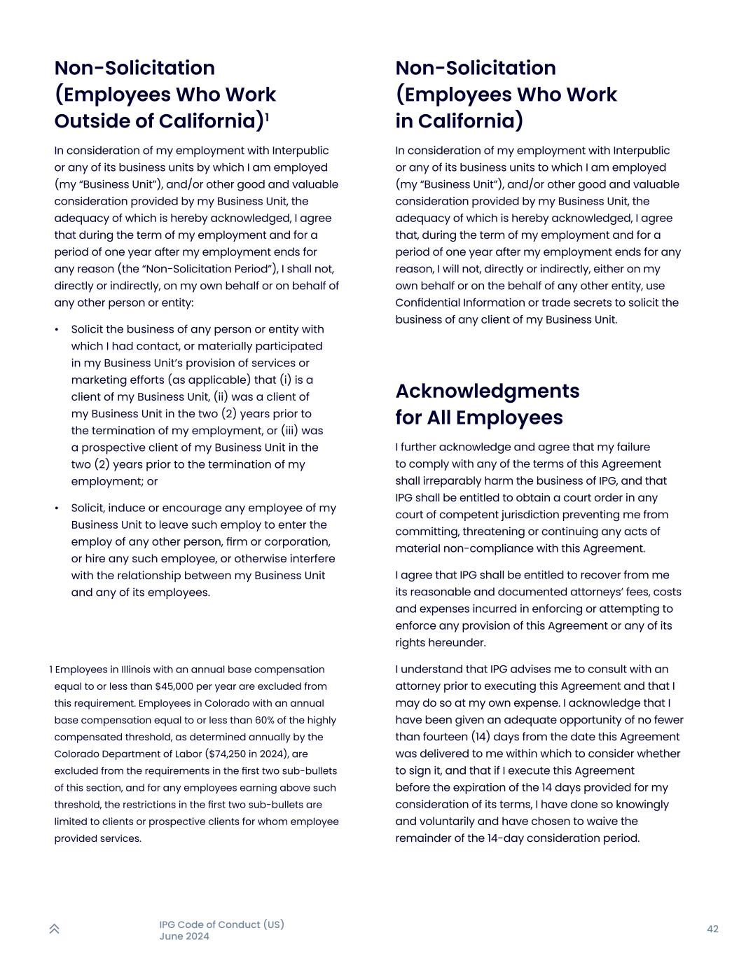 42IPG行为准则(美国)2024年6月非招揽(在加利福尼亚州以外工作的员工)1考虑到我受雇于InterPublic或其任何我受雇的业务部门(我的“业务部门”),和/或我的业务部门提供的其他良好和有价值的对价,特此确认其充分性,我同意,在我受雇的期限内以及在我因任何原因受雇结束后的一年期间(“非招揽期”),我不会直接或间接地,代表本人或代表任何其他个人或实体:•征求与我有过接触的任何个人或实体的业务,或实质上参与我的业务部门提供的服务或营销工作(如适用):(i)是我的业务部门的客户,(ii)在我的雇佣关系终止前两(2)年内是我的业务部门的客户,或(iii)在我的雇佣关系终止前两(2)年内是我的业务部门的潜在客户;或•征求,诱导或鼓励我的业务单位的任何雇员离开该雇员进入任何其他人、商号或法团的雇用,或雇用任何该等雇员,或以其他方式干预我的业务单位与其任何雇员之间的关系。非招揽(在加利福尼亚州工作的雇员)考虑到我受雇于InterPublic或我受雇于其任何业务部门(我的“业务部门”),和/或我的业务部门提供的其他良好和有价值的对价,其充分性在此确认,本人同意,在本人受雇期间和本人因任何原因受雇结束后的一年期间内,本人不会直接或间接代表本人或代表任何其他实体,利用机密信息或商业秘密招揽我事业单位任何客户的业务。全体员工致谢我进一步承认并同意,我未能遵守本协议的任何条款将对IPG的业务造成不可挽回的损害,并且IPG有权在任何有管辖权的法院获得法院命令,阻止我实施、威胁或继续任何重大不遵守本协议的行为。本人同意IPG有权向本人追偿其在执行或试图执行本协议的任何条款或其在本协议项下的任何权利过程中产生的合理且有文件证明的律师费、成本和费用。我的理解是,IPG建议我在执行本协议之前咨询律师,并且我可能会自费这样做。本人承认,自本协议交付本人之日起,我已获得不少于十四(14)天的充分机会,可在此期间考虑是否签署该协议,并且,如果我在为我考虑其条款而规定的14天届满之前执行本协议,我是在知情和自愿的情况下这样做的,并已选择放弃14天考虑期的剩余时间。1伊利诺伊州的年基本薪酬等于或低于每年4.5万美元的员工不在此要求之列。科罗拉多州年度基本薪酬等于或低于高薪酬门槛的60%(由科罗拉多州劳工部每年确定(2024年为74,250美元)的员工不在本节前两个子项目符号的要求之列,而对于任何收入超过该门槛的员工,前两个子项目符号中的限制仅限于员工为其提供服务的客户或潜在客户。