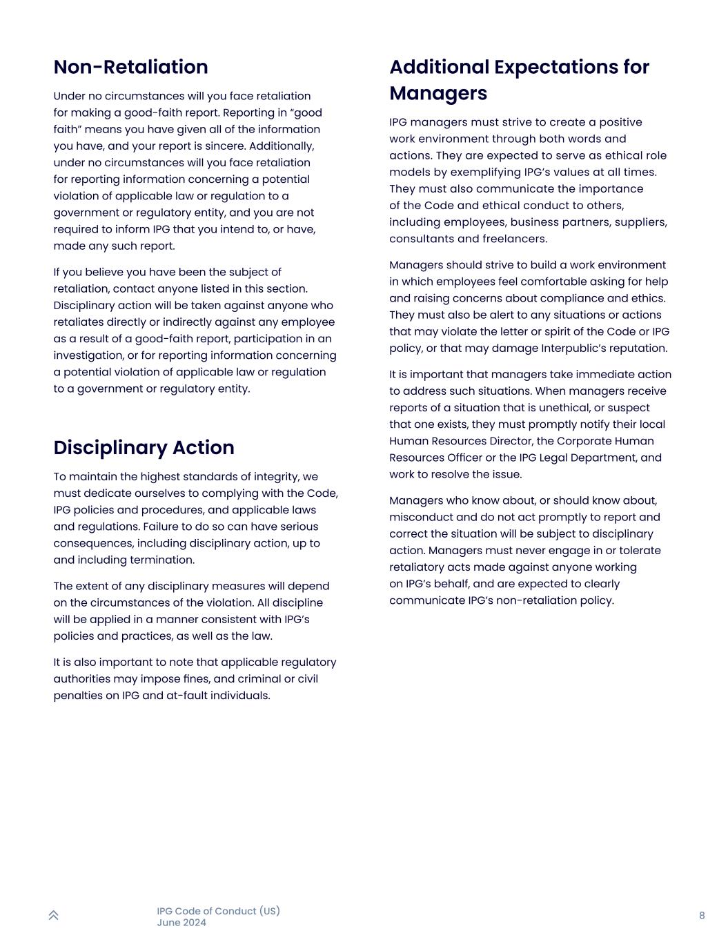 8IPG行为准则(美国)2024年6月不报复在任何情况下都不会因为做善意报告而面临报复。“善意”举报,是指你已经给出了你所掌握的全部信息,你的举报是真诚的。此外,在任何情况下,您都不会因向政府或监管实体报告可能违反适用法律或法规的信息而面临报复,您也无需告知IPG您打算或已经进行任何此类报告。如果你认为自己是被报复的对象,联系本节所列的任何人。将对因善意举报、参与调查或向政府或监管实体报告可能违反适用法律或法规的信息而直接或间接报复任何员工的任何人采取纪律处分。纪律处分要保持最高标准的廉洁,就必须献身于遵守守则、IPG政策和程序以及适用的法律法规。不这样做可能会产生严重后果,包括纪律处分,直至并包括终止。任何纪律措施的程度将取决于违规情况。所有学科的适用方式将与IPG的政策和做法以及法律相一致。还需要注意的是,适用的监管机构可能会对IPG和有过错的个人处以罚款、刑事或民事处罚。对管理者的额外期望IPG管理者必须通过言语和行动,努力创造积极向上的工作环境。他们被期望通过在任何时候都体现IPG的价值观,充当道德榜样。他们还必须向其他人,包括员工、商业伙伴、供应商、顾问和自由职业者传达《守则》和道德行为的重要性。管理人员应该努力营造一个工作环境,让员工能够放心地寻求帮助,并提出对合规和道德的担忧。也一定要警惕任何可能违反守则或IPG政策的文字或精神,或可能损害InterPublic声誉的情况或行为。重要的是,管理人员应立即采取行动应对此类情况。当管理人员收到有关不道德的情况的报告,或者怀疑存在这种情况时,他们必须及时通知当地的人力资源总监、公司人力资源主管或IPG法律部门,并努力解决该问题。对于明知或应知的不当行为,不及时报告和纠正情况的管理人员,将受到纪律处分。管理人绝不能从事、不能容忍对任何为IPG工作的人采取的报复性行为,并期望明确传达IPG的不报复政策。