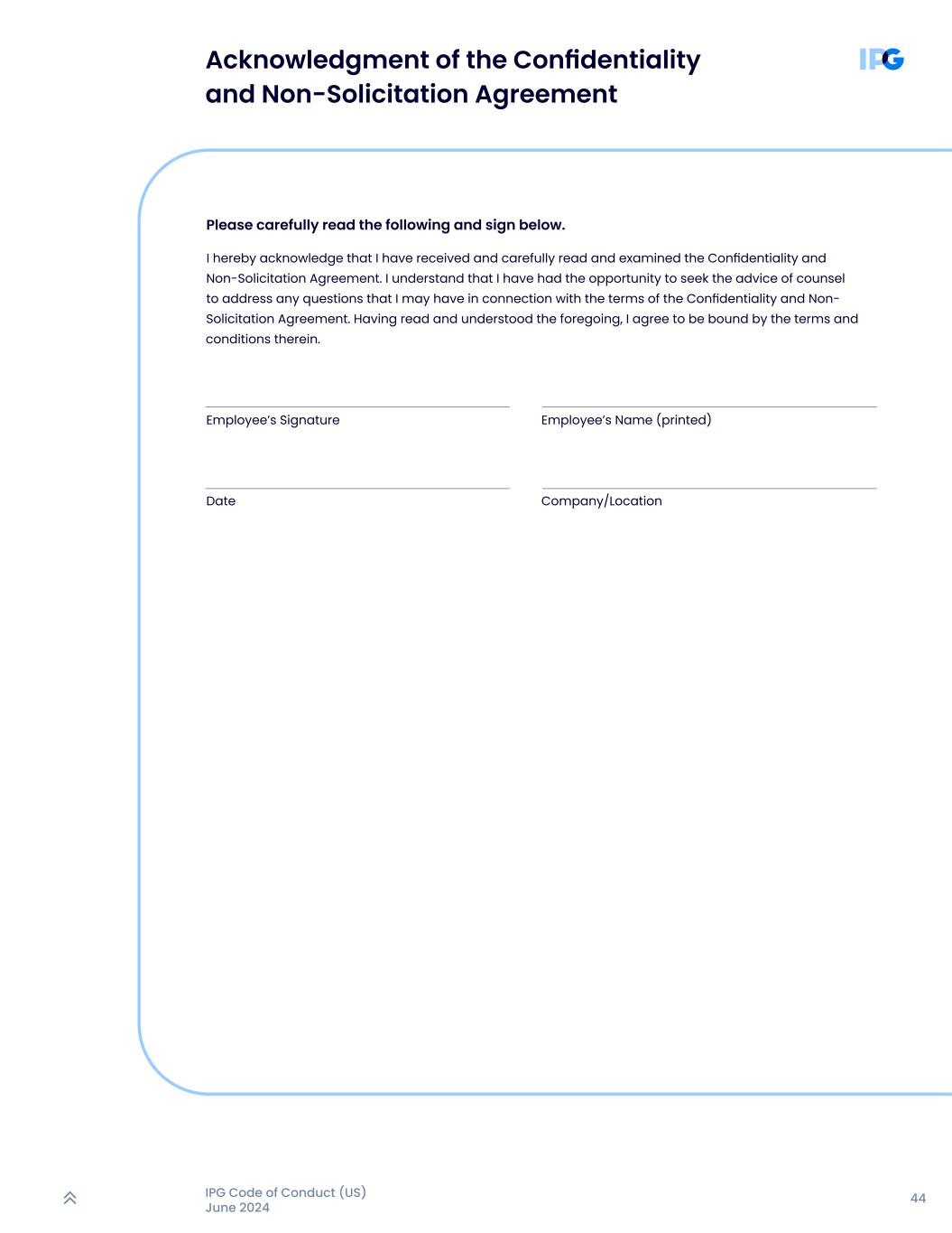 44IPG行为准则(美国)2024年6月请仔细阅读以下内容并在下方签名。特此确认,本人已收到并认真阅读、审查了《保密不招揽协议》。我了解我有机会寻求律师的建议,以解决我可能对保密和非征求协议条款提出的任何问题。阅读并理解前述内容后,本人同意受其中条款和条件的约束。员工签名员工姓名(打印)日期公司/地点确认保密不招揽协议