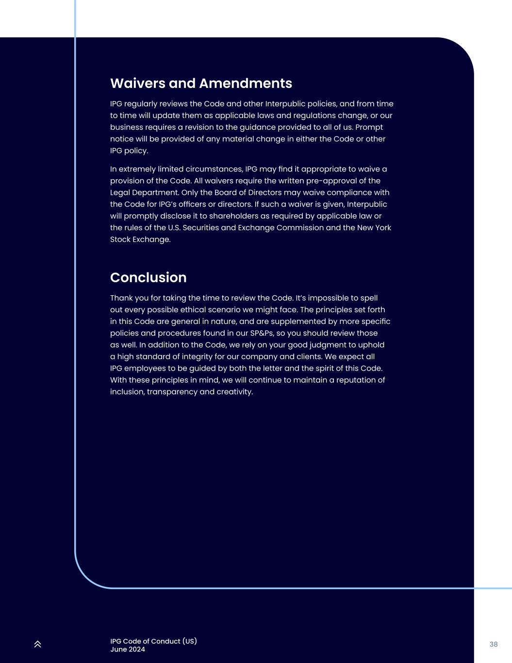 38IPG行为准则(美国)2024年6月豁免和修订IPG定期审查准则和其他国际公共政策,并会随着适用的法律法规发生变化,或者我们的业务需要对提供给我们所有人的指导进行修订而不时更新。有关守则或其他IPG政策的任何重大变更,我们将及时提供通知。在极其有限的情况下,IPG可能认为放弃守则的某一条款是适当的。所有的豁免都需要法律部门的书面预先批准。对于IPG的高级职员或董事,只有董事会可以放弃遵守守则。如果给予此类豁免,InterPublic将根据适用法律或美国证券交易委员会和纽约证券交易所规则的要求及时向股东披露。结束语感谢您抽空复习守则。不可能说出我们可能面临的每一个可能的道德场景。本准则中规定的原则本质上是一般性的,并辅以我们的SP & P中更具体的政策和程序,因此您也应该审查这些原则。除了准则,我们依靠您的良好判断,为我们的公司和客户坚持高标准的诚信。我们希望所有IPG员工在这份准则的文字和精神的双重指引下。牢记这些原则,我们将继续保持包容、透明和创造性的声誉。