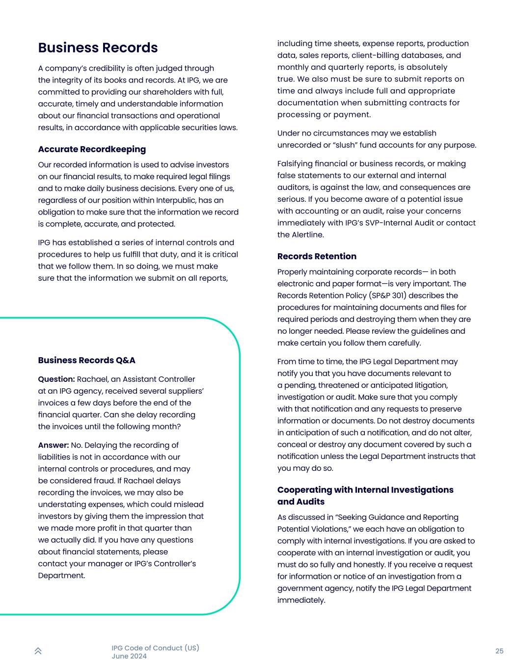 25IPG行为准则(美国)2024年6月商业记录一家公司的信誉通常通过其账簿和记录的完整性来判断。在IPG,我们致力于根据适用的证券法,为我们的股东提供有关我们的财务交易和运营结果的完整、准确、及时和易于理解的信息。准确的记录保存我们记录的信息用于就我们的财务业绩向投资者提供建议、进行必要的法律备案以及做出日常商业决策。我们每个人,无论我们在InterPublic中的地位如何,都有义务确保我们记录的信息是完整、准确和受保护的。IPG建立了一系列内部控制和程序来帮助我们履行这一职责,遵守这些控制和程序至关重要。在这样做时,我们必须确保我们提交的所有报告的信息,包括时间表、费用报告、生产数据、销售报告、客户账单数据库以及月度和季度报告,都是绝对真实的。我们还必须确保按时提交报告,并在提交处理或付款合同时始终包括完整和适当的文件。在任何情况下,我们都不得为任何目的建立未记录或“搪塞”的资金账户。伪造财务或业务记录,或向我们的外部和内部审计人员作出虚假陈述,都是违法的,后果很严重。如果您意识到会计或审计的潜在问题,请立即向IPG的高级副总裁-内部审计提出您的担忧,或联系Alertline。记录保留妥善维护企业记录——无论是电子形式还是纸质形式——都非常重要。记录保留政策(SP & P 301)描述了在规定期限内维护文件和档案并在不再需要时销毁它们的程序。请复查指引,并确保你认真遵守。如果您有与未决、威胁或预期的诉讼、调查或审计相关的文件,IPG法律部门可能会不时通知您。确保您遵守该通知以及保存信息或文件的任何请求。不要在预期收到此类通知时销毁文件,也不要更改、隐藏或销毁此类通知所涵盖的任何文件,除非法律部门指示您可以这样做。正如“寻求指导并报告潜在违规行为”中所讨论的那样,配合内部调查和审计,我们每个人都有义务遵守内部调查。如果你被要求配合内部调查或审计,你必须充分和诚实地这样做。如收到政府机构的信息索取或调查通知,请立即通知IPG法务部。业务记录问答题:Rachael,一家IPG机构的助理财务总监,在本财务季度结束的前几天收到了几家供应商的发票。她可以延迟到下个月才记录发票吗?答:没有。延迟记录负债不符合我们的内部控制或程序,可能被视为欺诈。如果Rachael延迟记录发票,我们也可能低估了费用,这可能会误导投资者,让他们觉得我们在该季度获得的利润比我们实际获得的利润要多。如对财务报表有任何疑问,请与您的管理人或IPG的控制人部门联系。