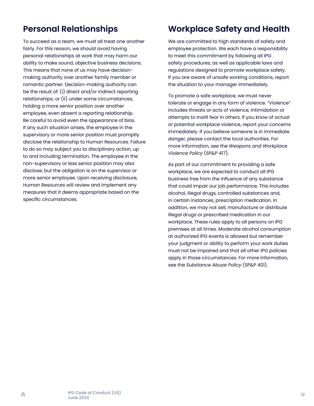 12IPG行为准则(美国)2024年6月个人关系要成功作为一个团队,我们都必须公平对待彼此。为此,我们应该避免在工作中出现可能损害我们做出合理、客观商业决策能力的个人关系。这意味着,我们谁都可能对另一个家庭成员或浪漫伴侣拥有决策权。决策权可以是以下情况的结果:(i)直接和/或间接报告关系;或(ii)在某些情况下,担任比另一名雇员更高级的职位,甚至没有报告关系。小心避免甚至出现偏见。如出现此类情况,主管或更高级职位的员工必须及时向人力资源部门披露关系。不这样做可能会使您受到纪律处分,直至并包括解雇。非主管或更高级职位的雇员也可以披露,但义务在主管或更高级的雇员身上。收到披露后,人力资源部将根据具体情况审查并实施其认为适当的任何措施。工作场所安全与健康我们致力于高标准的安全和员工保护。我们每个人都有责任遵守所有IPG安全程序,以及旨在促进工作场所安全的适用法律法规,从而履行这一承诺。如果你意识到不安全的工作条件,立即向你的经理报告情况。促进安全工作场所,绝不能容忍或从事任何形式的暴力行为。“暴力”包括威胁或暴力行为、恐吓或试图向他人灌输恐惧。如果你知道实际或潜在的工作场所暴力,立即报告你的担忧。如认为有人有即时危险,请与当地有关部门联系。欲了解更多信息,请参阅武器和工作场所暴力政策(SP & P 417)。作为我们提供安全工作场所承诺的一部分,我们被期望在开展所有IPG业务时不受任何可能损害我们工作绩效的物质的影响。这包括酒精、非法药物、受控物质,在某些情况下还包括处方药。此外,我们不得在工作场所销售、制造或分销非法药物或处方药。本规则适用于任何时候在IPG场所的所有人员。允许在经授权的IPG活动中适量饮酒,但请记住,您的判断力或履行工作职责的能力不得受到损害,并且在这些情况下适用所有其他IPG政策。有关更多信息,请参阅药物滥用政策(SP & P 401)。
