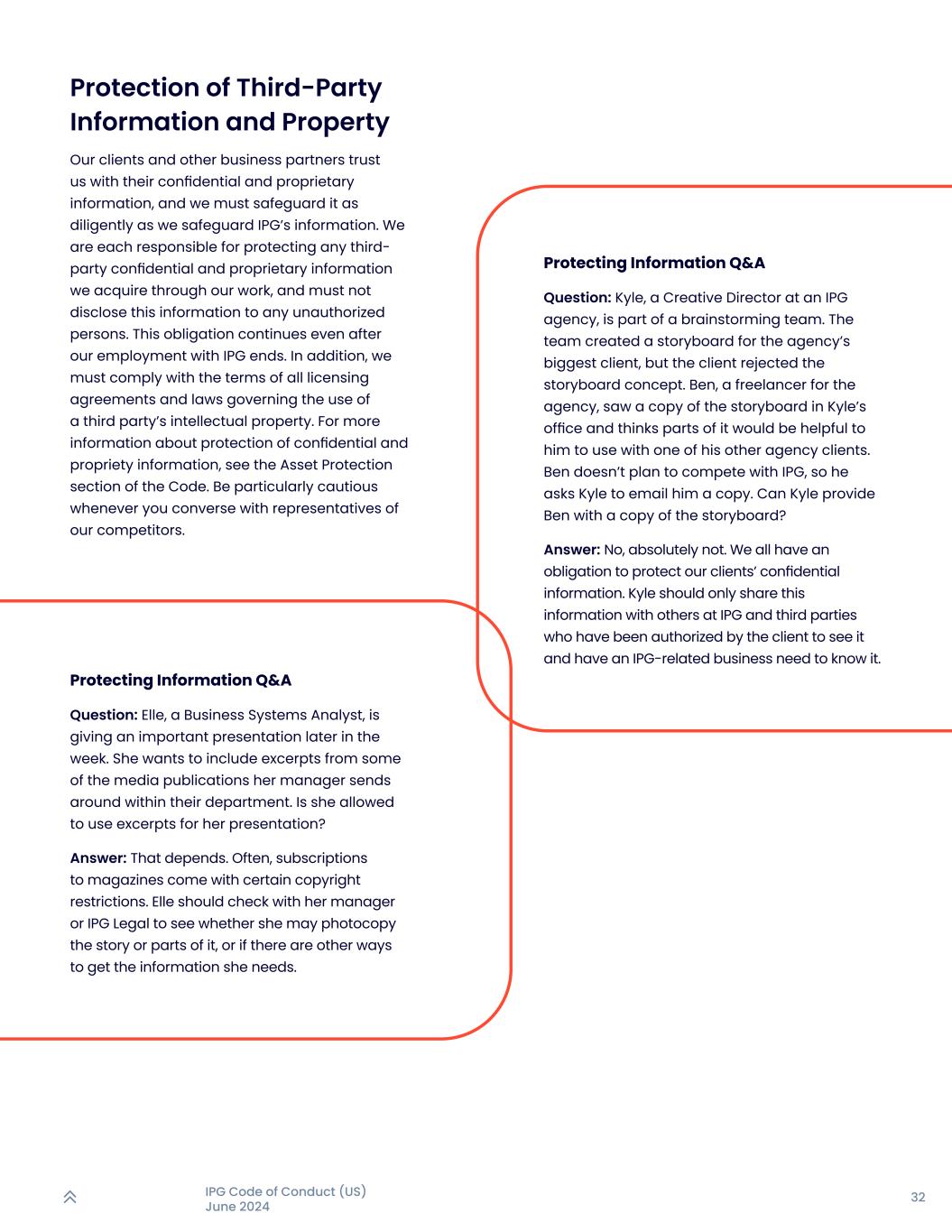 32IPG行为准则(美国)2024年6月保护信息问答提问:Kyle,是一家IPG机构的创意总监,是一个头脑风暴团队的一员。该团队为该机构最大的客户制作了一个故事板,但该客户拒绝了故事板的概念。本是该机构的一名自由职业者,他在凯尔的办公室里看到了一份分镜的副本,并认为其中的一部分对他与其他机构客户一起使用会有所帮助。Ben不打算和IPG竞争,所以让Kyle给他发邮件一份。凯尔能给本提供一份分镜的副本吗?答:不,绝对不会。我们都有义务保护客户的机密信息。这些信息Kyle应该只在IPG与他人分享,经客户授权可以看到并且有IPG相关业务的第三方需要知晓。第三方信息和财产的保护我们的客户和其他业务合作伙伴信任我们的机密和专有信息,我们必须像保护IPG的信息一样勤勉地保护它。我们每个人都有责任保护我们通过我们的工作获得的任何第三方机密和专有信息,并且不得将这些信息透露给任何未经授权的人。即使在我们与IPG的雇佣关系结束后,这一义务仍将继续。此外,我们必须遵守所有许可协议的条款和有关使用第三方知识产权的法律。有关保护机密和专有信息的更多信息,请参阅代码的资产保护部分。每当你与我们竞争对手的代表交谈时都要特别谨慎。保护信息问答问题:业务系统分析师Elle将在本周晚些时候做一个重要的演讲。她希望包括她的经理在他们部门内发送的一些媒体出版物的节选。她的演示文稿允许使用节选吗?答:那要看情况。订阅杂志通常会受到一定的版权限制。Elle应该去找她的经理或IPG法律部门核实一下,看看她是否会影印这个故事或其中的一部分,或者是否有其他方式可以获得她需要的信息。