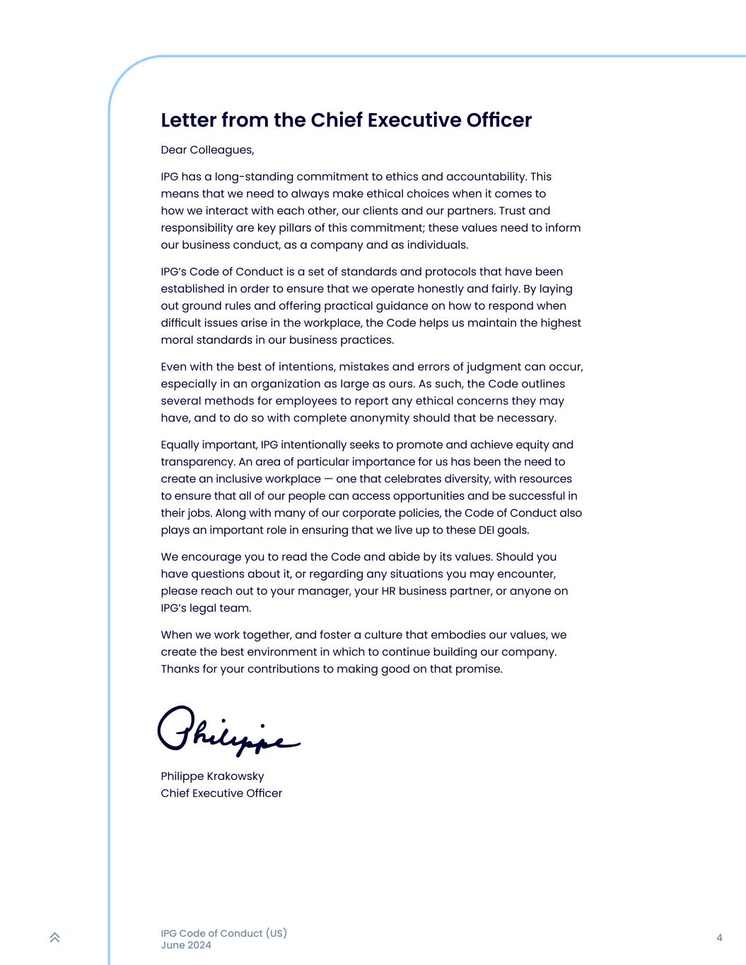 4IPG行为准则(美国)2024年6月首席执行官的信尊敬的同事们,IPG对道德和问责制有着长期的承诺。这意味着,当涉及到我们如何与彼此、客户和合作伙伴互动时,我们需要始终做出合乎道德的选择。信任和责任是这一承诺的关键支柱;这些价值观需要为我们的商业行为、作为一家公司和作为个人提供信息。IPG的行为准则是一套标准和协议,这些标准和协议是为了确保我们诚实、公平地运营而建立的。通过制定基本规则并就工作场所出现困难问题时如何应对提供实际指导,该准则帮助我们在业务实践中保持最高的道德标准。即使有最好的意图,判断的错误和错误也可能发生,尤其是在我们这样大的组织中。因此,《守则》概述了员工报告他们可能存在的任何道德问题的几种方法,如果有必要,则在完全匿名的情况下这样做。同样重要的是,IPG有意寻求促进并实现公平和透明。对我们来说,一个特别重要的领域是需要创造一个包容性的工作场所——一个颂扬多样性的工作场所,拥有确保我们所有人都能获得机会并在工作中取得成功的资源。与我们的许多公司政策一起,行为准则也在确保我们不辜负这些DEI目标方面发挥着重要作用。我们鼓励您阅读守则并遵守其价值观。如果您对此有任何疑问,或者关于您可能遇到的任何情况,请与您的经理、您的HR业务合作伙伴或IPG法律团队的任何人联系。当我们一起工作,并培养一种体现我们价值观的文化时,我们创造了继续建设我们公司的最佳环境。感谢您为兑现这一承诺所做的贡献。Philippe Krakowsky首席执行官