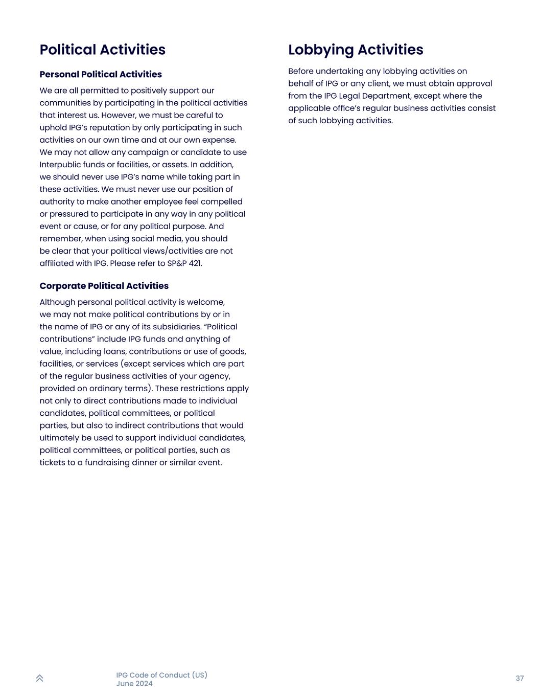 37IPG行为准则(美国)2024年6月政治活动个人政治活动我们都被允许通过参与我们感兴趣的政治活动来积极支持我们的社区。但是,只在自有时间、自费参加这类活动,要小心维护IPG的声誉。我们可能不允许任何竞选活动或候选人使用公共间资金或设施,或资产。另外,在参加这些活动的同时,千万不要使用IPG的名字。决不能利用我们的权威地位,让另一名员工感到被迫或压力,以任何方式参与任何政治事件或事业,或出于任何政治目的。并且记住,在使用社交媒体时,应该清楚自己的政治观点/活动不隶属于IPG。请参考SP & P 421。公司政治活动虽然欢迎个人政治活动,但我们不得由或以IPG或其任何子公司的名义进行政治献金。“政治献金”包括IPG资金和任何有价值的东西,包括贷款、捐款或使用商品、设施或服务(作为贵机构日常经营活动一部分的服务除外,按普通条款提供)。这些限制不仅适用于对个别候选人、政治委员会或政党的直接捐款,也适用于最终将用于支持个别候选人、政治委员会或政党的间接捐款,例如筹款晚宴或类似活动的门票。游说活动在代表IPG或任何客户进行任何游说活动之前,我们必须获得IPG法律部门的批准,除非适用的办公室的常规业务活动包括此类游说活动。