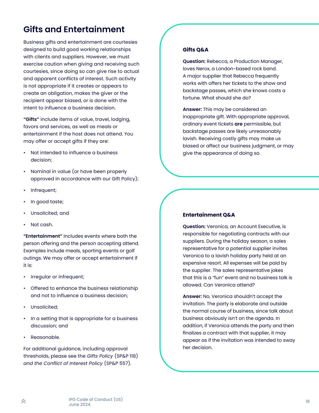 18IPG行为准则(美国)2024年6月礼品和娱乐商务礼品和娱乐是旨在与客户和供应商建立良好工作关系的礼遇。然而,我们在给予和接受这种礼遇时必须谨慎行事,因为这样做会引起实际和明显的利益冲突。如果这类活动造成或似乎造成了一项义务,使给予者或接受者显得有偏见,或意图影响商业决策,则这类活动是不合适的。“礼物”包括贵重物品、旅行、住宿、人情和服务,如果主人不出席,还包括餐饮或娱乐。在以下情况下,您可以提供或接受礼物:•无意影响商业决策;•名义价值(或已根据我们的礼物政策适当批准);•不经常;•品味良好;•不请自来;•不是现金。“娱乐”包括提供的人和接受的人都参加的活动。例子包括用餐、体育赛事或高尔夫郊游。在以下情况下,我们可能会提供或接受娱乐:•不规范或不经常;•提供以加强业务关系,不影响业务决策;•主动提供;•在适合进行业务讨论的环境中;以及•合理。更多指导,包括审批门槛,请看赠品政策(SP & P 118)和利益冲突政策(SP & P 557)。礼物问答题:丽贝卡,一个制作经理,喜欢总部在伦敦的摇滚乐队Nerox。丽贝卡经常合作的一家主要供应商为她提供演出门票和后台通行证,她知道这要花一大笔钱。她该怎么办?答:这可能被认为是不合适的礼物。有了适当的批准,普通赛事门票是允许的,但后台通行证很可能是不合理的奢侈。收受昂贵的礼物可能会使我们产生偏见或影响我们的商业判断,或可能给出这样做的表象。娱乐问答提问:Veronica,客户经理,负责与我们的供应商谈判合同。节日期间,一家潜在供应商的销售代表邀请Veronica参加在一家昂贵的度假村举办的奢华节日派对。所有费用将由供应商支付。售楼代表开玩笑说,这是一场“好玩”的活动,不允许谈生意。维罗妮卡能出席吗?答:不,维罗妮卡不应该接受邀请。聚会是精心制作的,超出了正常的业务过程,因为谈论业务显然不在议程上。此外,如果维罗妮卡出席派对,然后与该供应商敲定合同,这可能看起来像是邀请意在左右她的决定。