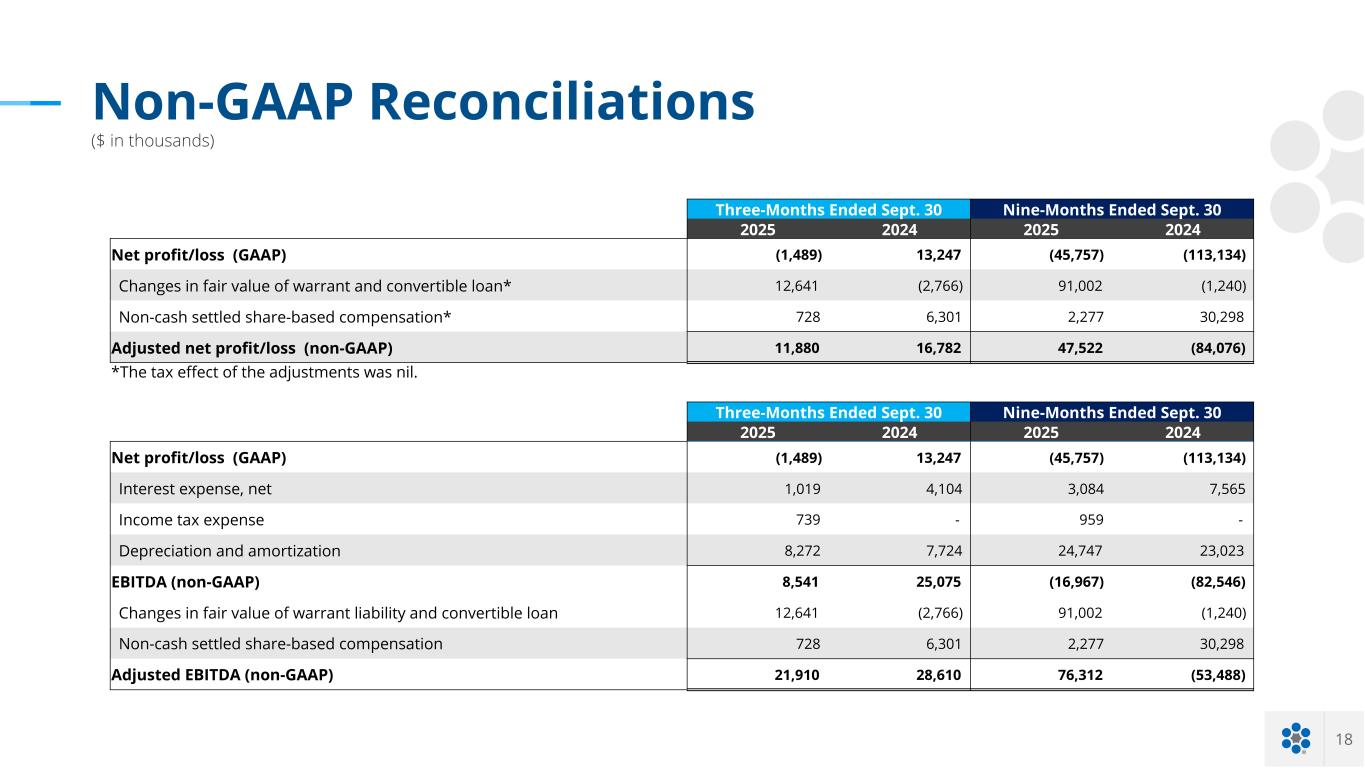 18非美国通用会计准则对账(千美元)截至9月30日的三个月截至9月30日的九个月2025202420252024净损益(GAAP)(1,489)13,247(45,757)(113,134)认股权证和可转换贷款的公允价值变动*12,641(2,766)91,002(1,240)非现金结算的股份补偿*7286,3012,27730,298调整后净利润/亏损(非美国通用会计准则)11,88016,78247,522(84,076)*调整的税收影响为零。截至9月30日止三个月截至9月30日止九个月2025202420252024净损益(GAAP)(1,489)13,247(45,757)(113,134)利息支出,净额1,0 194,1043,0847,565所得税费用739-959-折旧和摊销8,2727,72424,74723,023EBITDA(non-GAAP)8,54125,075(16,967)(82,546)认股权证负债和可转换贷款的公允价值变动12,641(2,766)91,002(1,240)非现金结算的股份补偿7286,3012,27730,298调整后EBITDA(non-GAAP)21,91028,61076,312(53,488)
