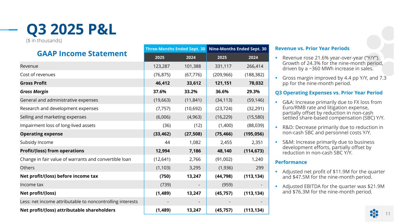 11 Q3 2025年损益表(千美元)GAAP损益表截至9月30日的三个月截至9月30日的九个月2025202420252024收入123,287101,388331,117266,414收入成本(76,875)(67,776)(209,966)(188,382)毛利46,41233,612121,15178,032毛利率37.6% 33.2% 36.6% 29.3%一般和管理费用(19,663)(11,841)(34,113)(59,146)研发费用(7,757)(10,692)(23,724)(32,291)销售和营销费用(6,006)(4,963)(16,229)(15,580)长期资产减值损失(36)(12)(1,400)(88,039)营业费用(33,462)(27,508)(75,466)(195,056)补贴收入441,0822,4552,351经营利润/(亏损)12,9947,18648,140(114,673)认股权证公允价值变动可转换贷款(12,641)2,766(91,002)1,240其他(1,103)3,295(1,936)299所得税前净利润/(亏损)(750)13,247(44,798)(113,134)所得税前净利润/(亏损)(739)-(959)-净利润/(亏损)(1,489)13,247(45,757)(113,134)减:归属于非控制性权益的净利润----归属于股东的净利润/(亏损)(1,489)13,247(45,757)(113,134)收入与上年同期相比§收入同比增长21.6%(“Y/Y”)。九个月期间增长24.3%,受销量增加约360兆瓦时带动。§毛利率同比改善4.4个百分点,九个月期间为7.3个百分点。第三季度运营费用与上年同期对比§ G & A:增加主要是由于欧元兑人民币汇率的外汇损失和诉讼费用,部分被非现金结算的股份薪酬(SBC)Y/Y的减少所抵消。§研发:减少主要是由于非现金SBC和人员成本Y/Y的减少。§ S & M:增加主要是由于业务发展努力,部分被非现金SBC Y/Y的减少所抵消。业绩§本季度调整后净利润为1190万美元,九个月期间为4750万美元。§本季度调整后EBITDA为2190万美元,九个月期间为7630万美元。