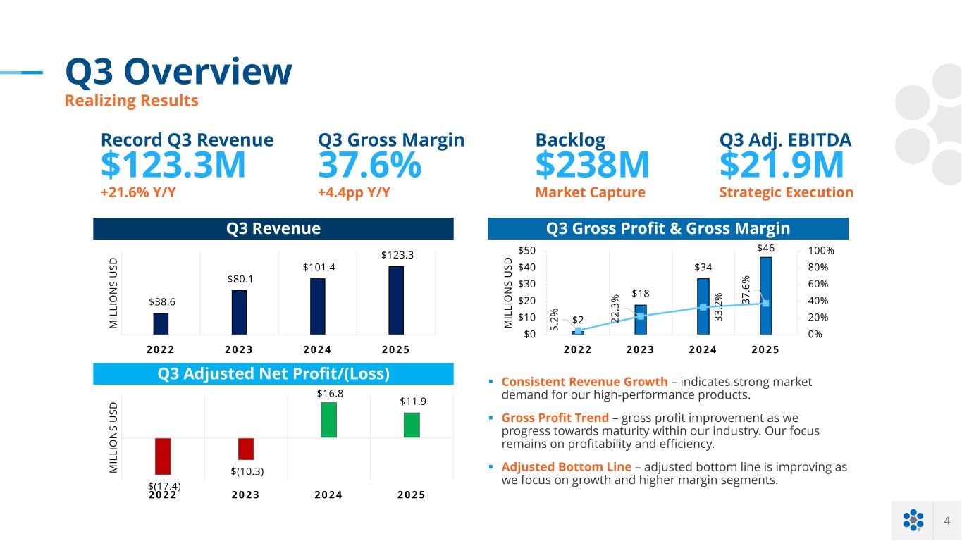 4 Q3概览实现业绩Q3收入Q3毛利&毛利率§收入持续增长–表明市场对我们高性能产品的强劲需求。§毛利趋势–随着我们在行业内走向成熟,毛利有所改善。我们的重点仍然是盈利能力和效率。§调整后的底线——随着我们专注于增长和利润率更高的细分市场,调整后的底线正在改善。创纪录的Q3收入1.233亿美元+ 21.6%同比积压2.38亿美元市场捕捉Q3毛利率37.6% + 4.4pp同比Q3调整后EBITDA 2190万美元战略执行Q3调整后净利润/(亏损)38.6美元80.1美元101.4美元123.32022202320242025百万IL LI O N S US SD $(17.4)$(10.3)$ 16.8 $ 11.9 2022202320242025百万IL LI O N S US SD $ 2 $ 18 $ 34 $ 465。2% 22.3% 33.2% 37.6% 0% 20% 40% 60% 80% 100% $ 0 $ 10 $ 20 $ 30 $ 40 $ 502022202320242025 m IL LI O N S US SD