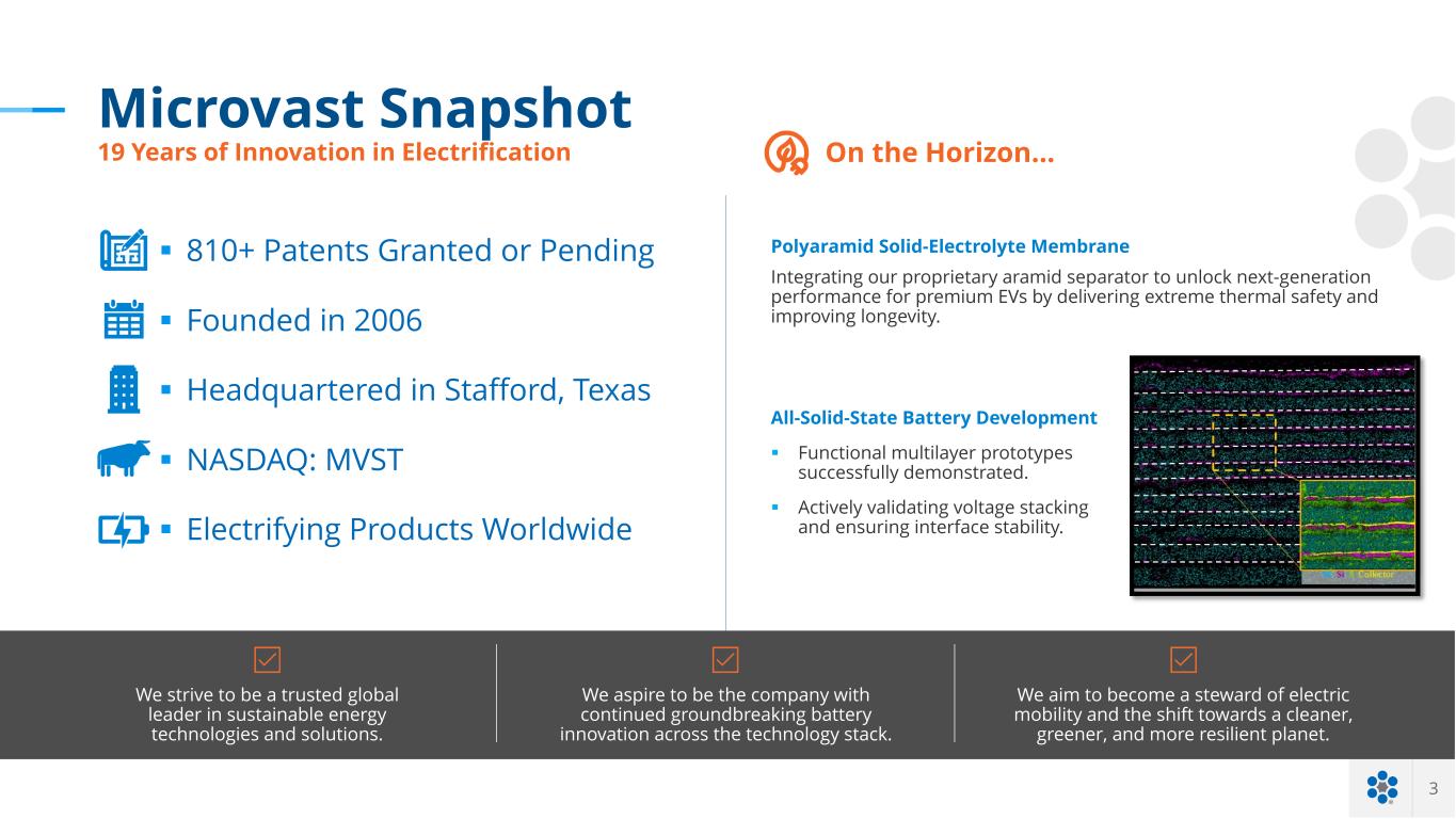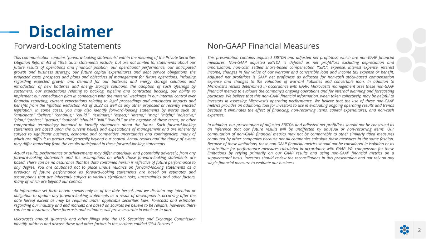 2免责声明前瞻性陈述本通讯包含1995年《私人证券诉讼改革法案》含义内的“前瞻性陈述”。此类陈述包括但不限于关于我们未来的经营业绩和财务状况、我们的经营业绩、我们的预期增长和业务战略、我们未来的资本支出和偿债义务、未来经营的预计成本、前景以及管理层的计划和目标的陈述,包括关于我们的电池和储能解决方案的预期增长和需求以及新电池和储能解决方案的引入、客户采用此类产品、我们对积压、管道和合同积压的预期,我们实施补救计划的能力与我们对财务报告的内部控制的重大缺陷、与法律诉讼相关的当前预期以及2022年《降低通胀法》以及任何其他拟议或最近颁布的立法的预期影响和收益有关。在某些情况下,您还可以通过“预期”、“相信”、“继续”、“可能”、“估计”、“预期”、“打算”、“可能”、“可能”、“目标”、“计划”、“项目”、“预测”、“展望”、“应该”、“将”、“将”或这些术语的否定词来识别前瞻性陈述,或旨在识别关于未来的陈述的其他类似术语。此类前瞻性陈述基于管理层当前的信念和预期,本质上受到重大业务、经济和竞争不确定性和突发事件的影响,其中许多是难以预测的,通常超出我们的控制范围。实际结果和事件发生的时间可能与这些前瞻性陈述中预期的结果存在重大差异。实际结果、业绩或成就可能与任何前瞻性陈述和这些前瞻性陈述所依据的假设存在重大差异,并可能产生不利影响。无法保证此处包含的数据在任何程度上都反映了未来的表现。请注意,不要过分依赖前瞻性陈述作为未来业绩的预测指标,因为前瞻性陈述基于的估计和假设本质上受到各种重大风险、不确定性和其他因素的影响,其中许多因素超出了我们的控制范围。本文所述的所有信息仅代表截至本文发布之日的情况,我们不承担因本文发布之日之后发生的事态发展而更新任何前瞻性陈述的任何意图或义务,但适用的证券法可能要求的除外。关于我们的行业和终端市场的预测和估计是基于我们认为可靠的来源,但是,无法保证这些预测和估计将全部或部分证明是准确的。Microvast向美国证券交易委员会提交的年度、季度和其他文件在题为“风险因素”的部分中确定、解决并讨论了这些因素和其他因素。非GAAP财务指标本演示文稿包含调整后EBITDA和调整后净利润/亏损,这是非GAAP财务指标。非GAAP调整后EBITDA定义为不包括折旧和摊销的净损益、非现金结算的股份补偿(“SBC”)费用、利息费用、利息收入、我们的认股权证和可转换贷款的公允价值变动以及所得税费用或收益。调整后的净利润/亏损为GAAP净利润/亏损,调整后的非现金股票补偿费用以及认股权证负债和可转换贷款的估值变化。除了Microvast根据GAAP确定的业绩外,Microvast的管理层还使用这些非GAAP财务指标来评估公司的持续运营,并用于内部规划和预测目的。我们认为,这些非GAAP财务信息,如果放在一起,可能有助于投资者评估Microvast的经营业绩。我们认为,使用这些非GAAP指标为投资者评估持续经营业绩和趋势提供了额外的工具,因为它消除了融资、非经常性项目、资本支出和非现金支出的影响。此外,我们对调整后EBITDA和调整后净利润/亏损的表述不应被解释为我们未来业绩将不受异常或非经常性项目影响的推断。我们对非GAAP财务指标的计算可能无法与其他公司计算的其他类似名称的指标进行比较,因为并非所有公司都以相同的方式计算这些指标。因为这些限制, 不应孤立地考虑这些非GAAP财务指标,也不应替代根据GAAP计算的业绩指标。我们主要依靠我们的GAAP结果并在补充基础上使用非GAAP财务指标来弥补这些限制。投资者应审查本演示文稿中的对账情况,而不是依赖任何单一的财务指标来评估我们的业务。