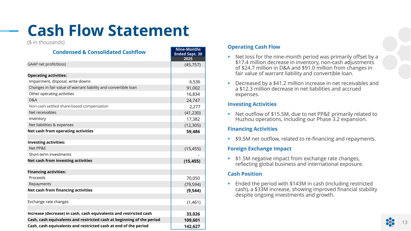 13现金流量表(千美元)经营现金流§九个月期间的净亏损主要被库存减少1740万美元、D & A非现金调整2470万美元以及认股权证负债和可转换贷款公允价值变动带来的9100万美元所抵消。§减少应收账款净额增加4120万美元,净负债和应计费用减少1230万美元。投资活动§净流出1550万美元,原因是净PP & E主要与湖州业务相关,包括我们的3.2期扩张。融资活动§ 950万美元净流出,与再融资和还款有关。外汇影响§汇率变动带来的150万美元负面影响,反映了全球业务和国际风险敞口。现金状况§期末现金为1.43亿美元(包括受限现金),增加了3300万美元,显示尽管持续投资和增长,但财务稳定性有所改善。截至2025年9月30日止九个月的简明和合并现金流GAAP净利润/(亏损)(45,757)经营活动:减值、处置、减记6,536认股权证负债和可转换贷款的公允价值变动91,002其他经营活动16,834 D & A 24,747非现金结算的股份补偿2,277应收账款净额(41,230)存货17,382净负债和费用(12,305)经营活动产生的现金净额59,486投资活动:净PP & E(15,455)短期投资-投资活动产生的现金净额(15,455)融资活动:收益70,050还款(79,594)筹资活动产生的现金净额(9,544)汇率变动(1,461)现金增加(减少),现金等价物和受限制现金33,026期初现金、现金等价物和受限制现金109,601期末现金、现金等价物和受限制现金142,627