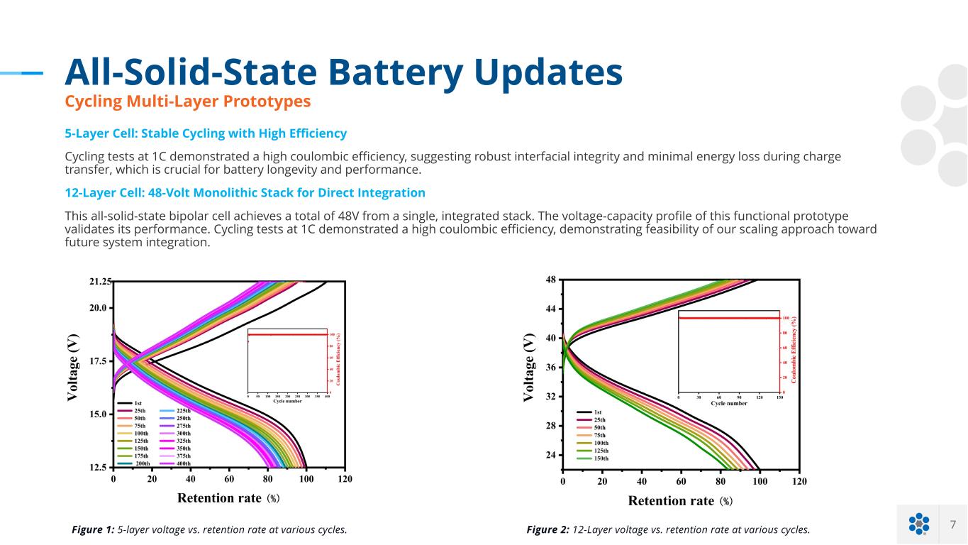 7全固态电池更新循环多层原型5层电池:稳定循环与1C下的高效循环测试显示出高库伦效率,表明在电荷转移过程中具有强大的界面完整性和最小的能量损失,这对于电池寿命和性能至关重要。12层电池:用于直接集成的48伏单片电堆这款全固态双极电池从单一的集成电堆实现了总共48V。该功能原型的电压容量曲线验证了其性能。1C下的循环测试证明了高库仑效率,证明了我们的缩放方法对未来系统集成的可行性。图1:5层电压vs.不同循环下的保持率。图2:12层电压vs.不同循环下的保持率。