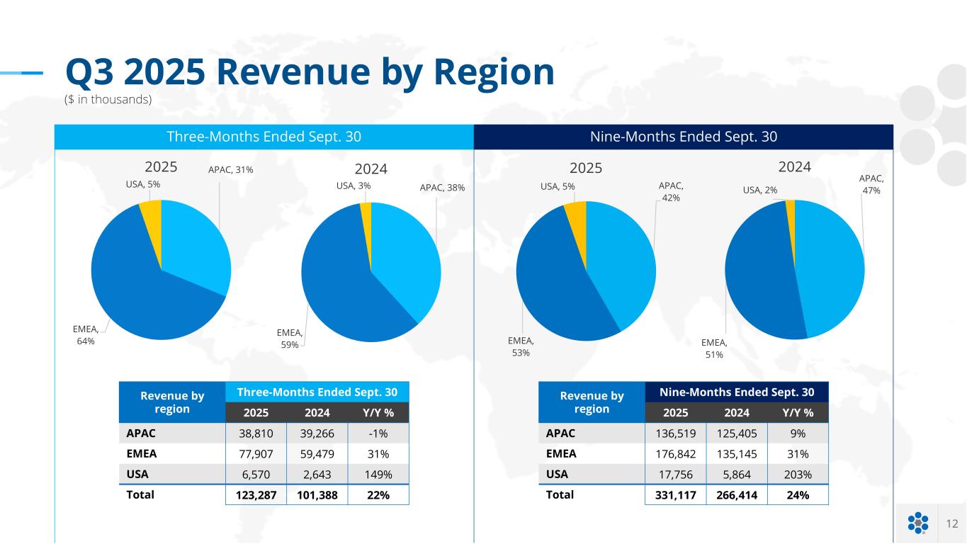 2025年第三季度按地区划分的收入(千美元)按地区划分的收入截至2025年9月30日的三个月2024年Y/Y %亚太地区38,81039,266-1 %欧洲、中东和非洲地区77,90759,47931%美国6,5702,643149%总计123,287101,38822%截至9月30日的三个月按地区划分的收入截至2025年9月30日的九个月2024年Y/Y %亚太地区136,519125,4059%欧洲、中东和非洲地区176,842135,14531%美国17,7565,864203%总计331,117266,41424%截至9月30日的九个月亚太地区31%欧洲、中东和非洲地区64%美国5% 2025年亚太地区38%欧洲、中东和非洲地区59%美国3% 2024年亚太地区42%欧洲、中东和非洲地区53%美国5%