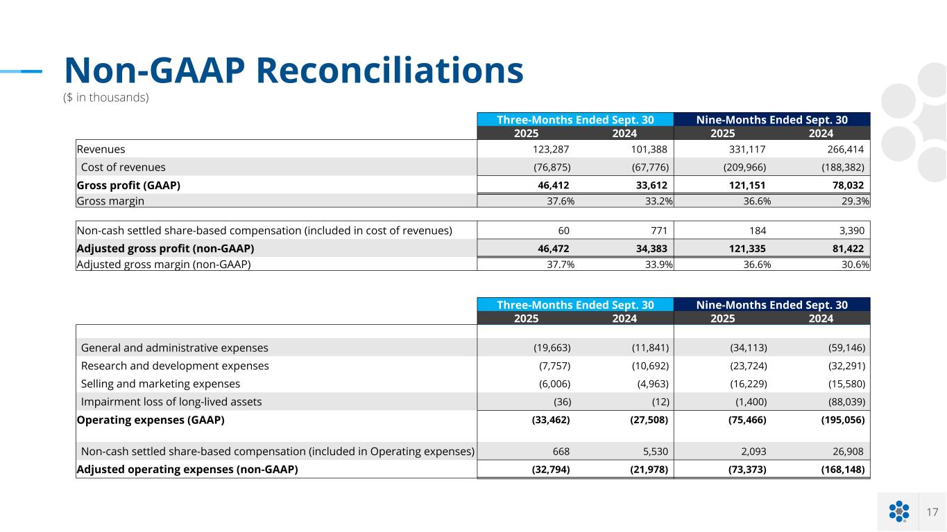 17非美国通用会计准则对账(千美元)截至9月30日的三个月截至9月30日的九个月2025202420252024收入123,287101,388331,117266,414收入成本(76,875)(67,776)(209,966)(188,382)毛利润(GAAP)46,41233,612121,15178,032毛利率37.6% 33.2% 36.6% 29.3%非现金结算的股份报酬(计入收入成本)60771184,390调整后毛利润(非美国通用会计准则)46,47234,383121,33581,422调整后毛利率(非美国通用会计准则)37.7% 33.9% 36.6% 30.6%截至9月30日的三个月截至9月30日的九个月2025202420252024一般和行政和开发费用(7,757)(10,692)(23,724)(32,291)销售和营销费用(6,006)(4,963)(16,229)(15,580)长期资产减值损失(36)(12)(1,400)(88,039)运营费用(GAAP)(33,462)(27,508)(75,466)(195,056)非现金结算的股份报酬(计入运营费用)6685,5302,09326,908调整后的运营费用(非GAAP)(32,794)(21,978)(73,373)(168,148)