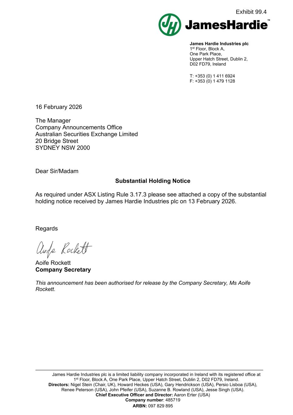 詹姆斯哈迪 plc 1st Floor,One Park Place,Upper Hatch Street,Dublin 2,D02 FD79,Ireland电话:+ 353(0)14116924 F:+ 353(0)14791128 詹姆斯哈迪 plc是一家在爱尔兰注册成立的有限责任公司,注册办事处位于爱尔兰Dublin 2,D02 FD79,Upper Hatch Street,One Park Place,Block A座1st Floor。董事:Nigel Stein(主席,英国)、Howard Heckes(美国)、Gary Hendrickson(美国)、Persio Lisboa(美国)、Renee Peterson(美国)、John Pfeifer(美国)、Suzanne B. Rowland(美国)、Jesse Singh(美国)。首席执行官兼董事:Aaron Erter(美国)公司编号:485719 ARBN:0978298952026年2月16日管理人公司公告办公室Australian Securities Exchange Limited 20 Bridge Street SYDNEY NSW 2000尊敬的先生/女士根据ASX上市规则第3.17.3条的要求发出的实质性持股通知请参阅附件中所附的一份由詹姆斯哈迪 plc于2026年2月13日收到的实质性持股通知的副本。关于Aoife Rockett公司秘书本公告已获公司秘书Aoife Rockett女士授权发布。