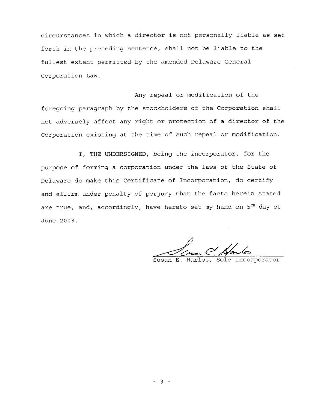 在前一句中所述的董事不承担个人责任的情况下,在经修订的《特拉华州一般公司法》允许的最大范围内不承担责任。公司股东对前款的任何撤销或修改,均不会对撤销或修改时存在的公司董事的任何权利或保护产生不利影响。本人,以下签署人,作为公司的发起人,为根据特拉华州法律组建公司的目的,确实制作了本公司注册证书,确实证明并确认了本文陈述的事实是真实的,因此,请于2003年6月5日在此与我握手。Susan E.Harlos先生,独资公司-3-