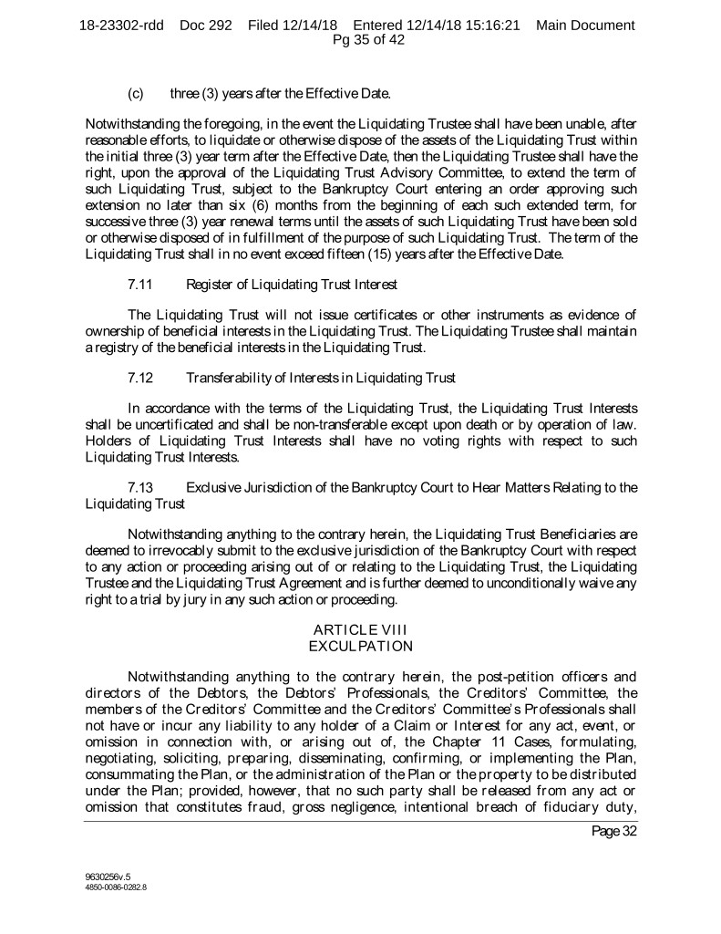 18-23302-rdd Doc 292 Filed 12/14/18 Entered 12/14/18 15:16:21 Main Document Pg 35 of 42 (c) three (3) years after the Effective Date. Notwithstanding the foregoing, in the event the Liquidating Trustee shall have been unable, after reasonable efforts, to liquidate or otherwise dispose of the assets of the Liquidating Trust within the initial three (3) year term after the Effective Date, then the Liquidating Trustee shall have the right, upon the approval of the Liquidating Trust Advisory Committee, to extend the term of such Liquidating Trust, subject to the Bankruptcy Court entering an order approving such extension no later than six (6) months from the beginning of each such extended term, for successive three (3) year renewal terms until the assets of such Liquidating Trust have been sold or otherwise disposed of in fulfillment of the purpose of such Liquidating Trust. The term of the Liquidating Trust shall in no event exceed fifteen (15) years after the Effective Date. 7.11 Register of Liquidating Trust Interest The Liquidating Trust will not issue certificates or other instruments as evidence of ownership of beneficial interests in the Liquidating Trust. The Liquidating Trustee shall maintain a registry of the beneficial interests in the Liquidating Trust. 7.12 Transferability of Interests in Liquidating Trust In accordance with the terms of the Liquidating Trust, the Liquidating Trust Interests shall be uncertificated and shall be non-transferable except upon death or by operation of law. Holders of Liquidating Trust Interests shall have no voting rights with respect to such Liquidating Trust Interests. 7.13 Exclusive Jurisdiction of the Bankruptcy Court to Hear Matters Relating to the Liquidating Trust Notwithstanding anything to the contrary herein, the Liquidating Trust Beneficiaries are deemed to irrevocably submit to the exclusive jurisdiction of the Bankruptcy Court with respect to any action or proceeding arising out of or relating to the Liquidating Trust, the Liquidating Trustee and the Liquidating Trust Agreement and is further deemed to unconditionally waive any right to a trial by jury in any such action or proceeding. ARTICLE VIII EXCULPATION Notwithstanding anything to the contrary herein, the post-petition officers and directors of the Debtors, the Debtors’ Professionals, the Creditors’ Committee, the members of the Creditors’ Committee and the Creditors’ Committee’s Professionals shall not have or incur any liability to any holder of a Claim or Interest for any act, event, or omission in connection with, or arising out of, the Chapter 11 Cases, formulating, negotiating, soliciting, preparing, disseminating, confirming, or implementing the Plan, consummating the Plan, or the administration of the Plan or the property to be distributed under the Plan; provided, however, that no such party shall be released from any act or omission that constitutes fraud, gross negligence, intentional breach of fiduciary duty, Page 32 9630256v.5 4850-0086-0282.8