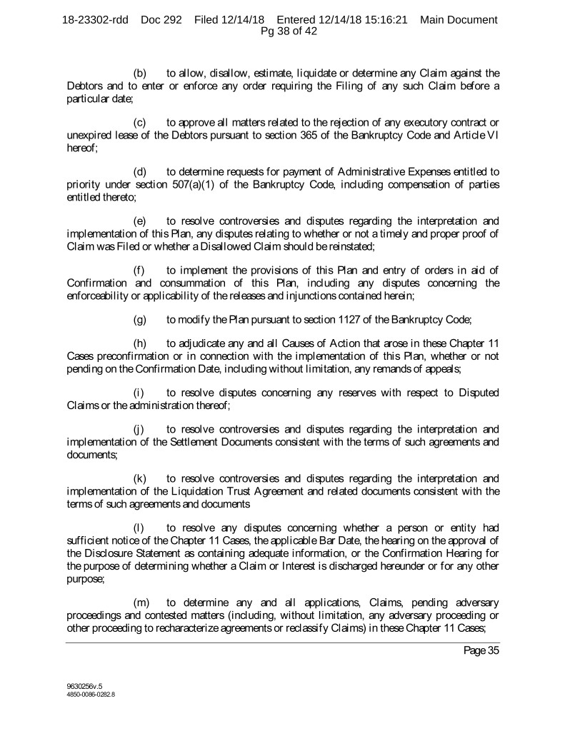 18-23302-rdd Doc 292 Filed 12/14/18 Entered 12/14/18 15:16:21 Main Document Pg 38 of 42 (b) to allow, disallow, estimate, liquidate or determine any Claim against the Debtors and to enter or enforce any order requiring the Filing of any such Claim before a particular date; (c) to approve all matters related to the rejection of any executory contract or unexpired lease of the Debtors pursuant to section 365 of the Bankruptcy Code and Article VI hereof; (d) to determine requests for payment of Administrative Expenses entitled to priority under section 507(a)(1) of the Bankruptcy Code, including compensation of parties entitled thereto; (e) to resolve controversies and disputes regarding the interpretation and implementation of this Plan, any disputes relating to whether or not a timely and proper proof of Claim was Filed or whether a Disallowed Claim should be reinstated; (f) to implement the provisions of this Plan and entry of orders in aid of Confirmation and consummation of this Plan, including any disputes concerning the enforceability or applicability of the releases and injunctions contained herein; (g) to modify the Plan pursuant to section 1127 of the Bankruptcy Code; (h) to adjudicate any and all Causes of Action that arose in these Chapter 11 Cases preconfirmation or in connection with the implementation of this Plan, whether or not pending on the Confirmation Date, including without limitation, any remands of appeals; (i) to resolve disputes concerning any reserves with respect to Disputed Claims or the administration thereof; (j) to resolve controversies and disputes regarding the interpretation and implementation of the Settlement Documents consistent with the terms of such agreements and documents; (k) to resolve controversies and disputes regarding the interpretation and implementation of the Liquidation Trust Agreement and related documents consistent with the terms of such agreements and documents (l) to resolve any disputes concerning whether a person or entity had sufficient notice of the Chapter 11 Cases, the applicable Bar Date, the hearing on the approval of the Disclosure Statement as containing adequate information, or the Confirmation Hearing for the purpose of determining whether a Claim or Interest is discharged hereunder or for any other purpose; (m) to determine any and all applications, Claims, pending adversary proceedings and contested matters (including, without limitation, any adversary proceeding or other proceeding to recharacterize agreements or reclassify Claims) in these Chapter 11 Cases; Page 35 9630256v.5 4850-0086-0282.8