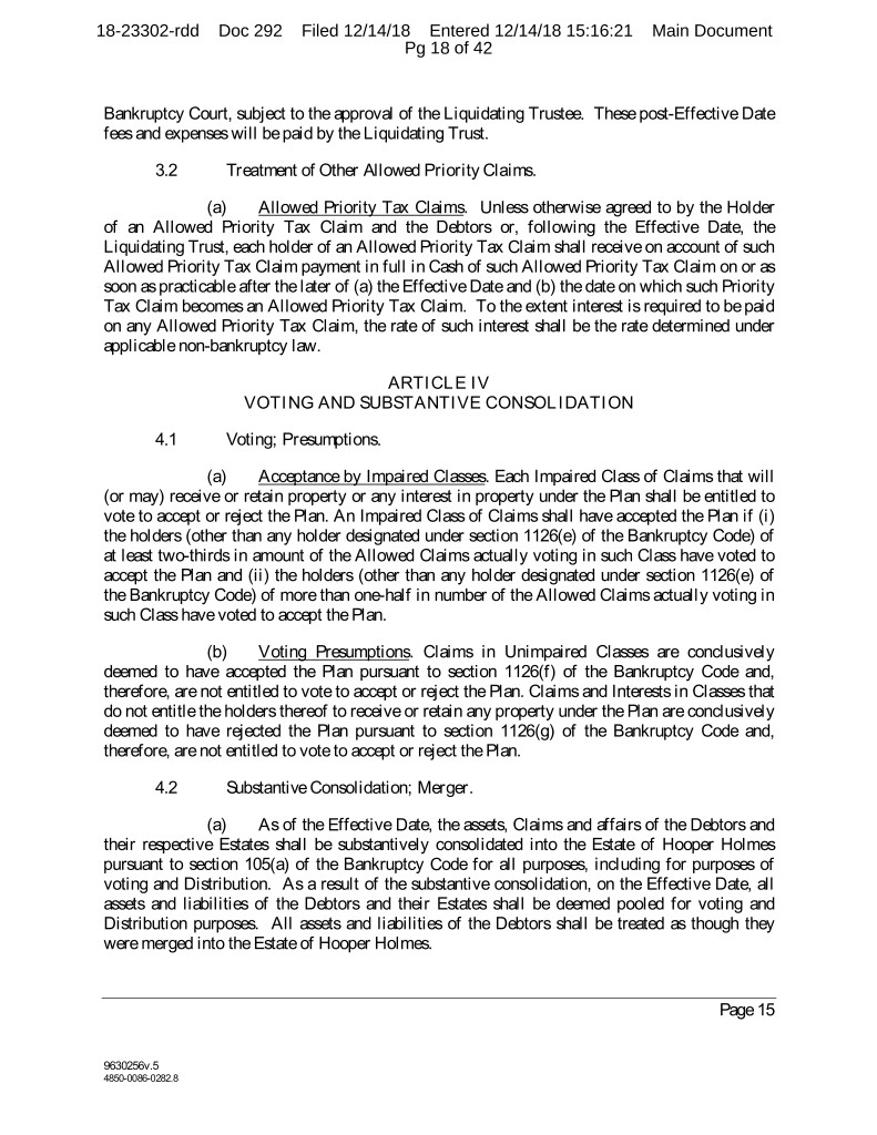 18-23302-rdd Doc 292 Filed 12/14/18 Entered 12/14/18 15:16:21 Main Document Pg 18 of 42 Bankruptcy Court, subject to the approval of the Liquidating Trustee. These post-Effective Date fees and expenses will be paid by the Liquidating Trust. 3.2 Treatment of Other Allowed Priority Claims. (a) Allowed Priority Tax Claims. Unless otherwise agreed to by the Holder of an Allowed Priority Tax Claim and the Debtors or, following the Effective Date, the Liquidating Trust, each holder of an Allowed Priority Tax Claim shall receive on account of such Allowed Priority Tax Claim payment in full in Cash of such Allowed Priority Tax Claim on or as soon as practicable after the later of (a) the Effective Date and (b) the date on which such Priority Tax Claim becomes an Allowed Priority Tax Claim. To the extent interest is required to be paid on any Allowed Priority Tax Claim, the rate of such interest shall be the rate determined under applicable non-bankruptcy law. ARTICLE IV VOTING AND SUBSTANTIVE CONSOLIDATION 4.1 Voting; Presumptions. (a) Acceptance by Impaired Classes. Each Impaired Class of Claims that will (or may) receive or retain property or any interest in property under the Plan shall be entitled to vote to accept or reject the Plan. An Impaired Class of Claims shall have accepted the Plan if (i) the holders (other than any holder designated under section 1126(e) of the Bankruptcy Code) of at least two-thirds in amount of the Allowed Claims actually voting in such Class have voted to accept the Plan and (ii) the holders (other than any holder designated under section 1126(e) of the Bankruptcy Code) of more than one-half in number of the Allowed Claims actually voting in such Class have voted to accept the Plan. (b) Voting Presumptions. Claims in Unimpaired Classes are conclusively deemed to have accepted the Plan pursuant to section 1126(f) of the Bankruptcy Code and, therefore, are not entitled to vote to accept or reject the Plan. Claims and Interests in Classes that do not entitle the holders thereof to receive or retain any property under the Plan are conclusively deemed to have rejected the Plan pursuant to section 1126(g) of the Bankruptcy Code and, therefore, are not entitled to vote to accept or reject the Plan. 4.2 Substantive Consolidation; Merger. (a) As of the Effective Date, the assets, Claims and affairs of the Debtors and their respective Estates shall be substantively consolidated into the Estate of Hooper Holmes pursuant to section 105(a) of the Bankruptcy Code for all purposes, including for purposes of voting and Distribution. As a result of the substantive consolidation, on the Effective Date, all assets and liabilities of the Debtors and their Estates shall be deemed pooled for voting and Distribution purposes. All assets and liabilities of the Debtors shall be treated as though they were merged into the Estate of Hooper Holmes. Page 15 9630256v.5 4850-0086-0282.8
