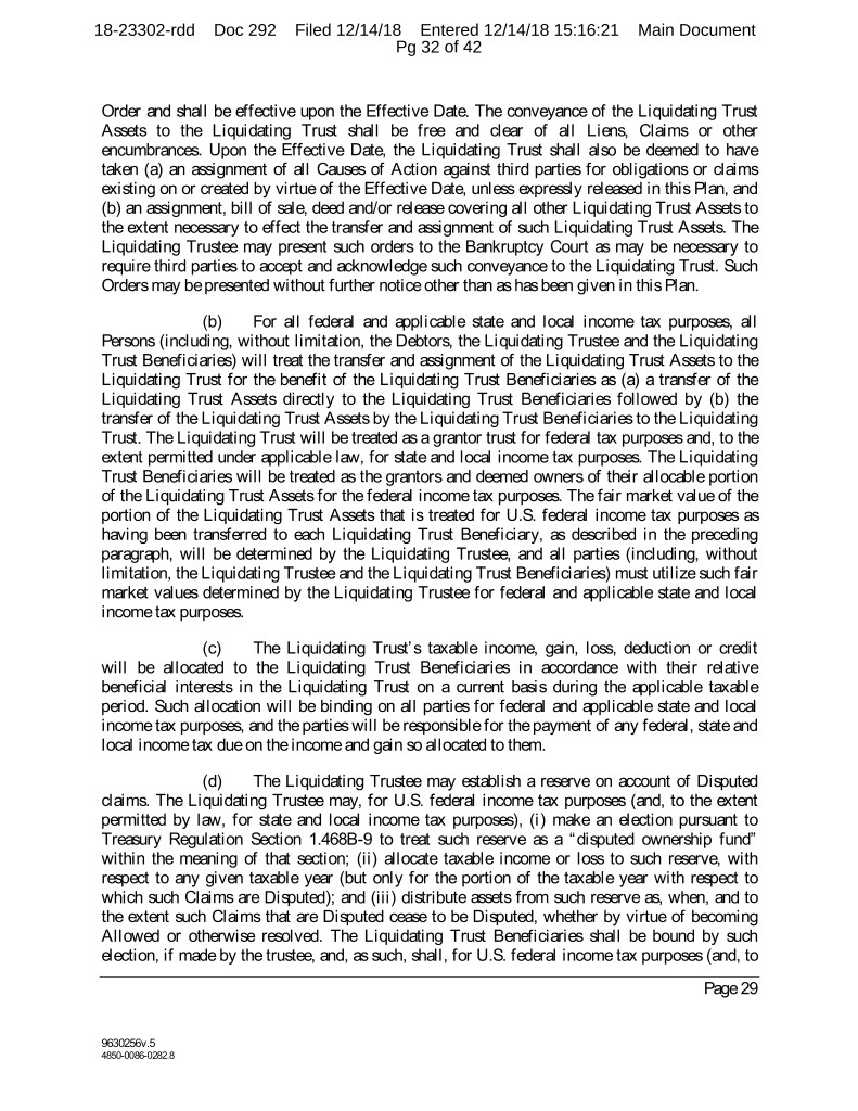 18-23302-rdd Doc 292 Filed 12/14/18 Entered 12/14/18 15:16:21 Main Document Pg 32 of 42 Order and shall be effective upon the Effective Date. The conveyance of the Liquidating Trust Assets to the Liquidating Trust shall be free and clear of all Liens, Claims or other encumbrances. Upon the Effective Date, the Liquidating Trust shall also be deemed to have taken (a) an assignment of all Causes of Action against third parties for obligations or claims existing on or created by virtue of the Effective Date, unless expressly released in this Plan, and (b) an assignment, bill of sale, deed and/or release covering all other Liquidating Trust Assets to the extent necessary to effect the transfer and assignment of such Liquidating Trust Assets. The Liquidating Trustee may present such orders to the Bankruptcy Court as may be necessary to require third parties to accept and acknowledge such conveyance to the Liquidating Trust. Such Orders may be presented without further notice other than as has been given in this Plan. (b) For all federal and applicable state and local income tax purposes, all Persons (including, without limitation, the Debtors, the Liquidating Trustee and the Liquidating Trust Beneficiaries) will treat the transfer and assignment of the Liquidating Trust Assets to the Liquidating Trust for the benefit of the Liquidating Trust Beneficiaries as (a) a transfer of the Liquidating Trust Assets directly to the Liquidating Trust Beneficiaries followed by (b) the transfer of the Liquidating Trust Assets by the Liquidating Trust Beneficiaries to the Liquidating Trust. The Liquidating Trust will be treated as a grantor trust for federal tax purposes and, to the extent permitted under applicable law, for state and local income tax purposes. The Liquidating Trust Beneficiaries will be treated as the grantors and deemed owners of their allocable portion of the Liquidating Trust Assets for the federal income tax purposes. The fair market value of the portion of the Liquidating Trust Assets that is treated for U.S. federal income tax purposes as having been transferred to each Liquidating Trust Beneficiary, as described in the preceding paragraph, will be determined by the Liquidating Trustee, and all parties (including, without limitation, the Liquidating Trustee and the Liquidating Trust Beneficiaries) must utilize such fair market values determined by the Liquidating Trustee for federal and applicable state and local income tax purposes. (c) The Liquidating Trust’s taxable income, gain, loss, deduction or credit will be allocated to the Liquidating Trust Beneficiaries in accordance with their relative beneficial interests in the Liquidating Trust on a current basis during the applicable taxable period. Such allocation will be binding on all parties for federal and applicable state and local income tax purposes, and the parties will be responsible for the payment of any federal, state and local income tax due on the income and gain so allocated to them. (d) The Liquidating Trustee may establish a reserve on account of Disputed claims. The Liquidating Trustee may, for U.S. federal income tax purposes (and, to the extent permitted by law, for state and local income tax purposes), (i) make an election pursuant to Treasury Regulation Section 1.468B-9 to treat such reserve as a “disputed ownership fund” within the meaning of that section; (ii) allocate taxable income or loss to such reserve, with respect to any given taxable year (but only for the portion of the taxable year with respect to which such Claims are Disputed); and (iii) distribute assets from such reserve as, when, and to the extent such Claims that are Disputed cease to be Disputed, whether by virtue of becoming Allowed or otherwise resolved. The Liquidating Trust Beneficiaries shall be bound by such election, if made by the trustee, and, as such, shall, for U.S. federal income tax purposes (and, to Page 29 9630256v.5 4850-0086-0282.8