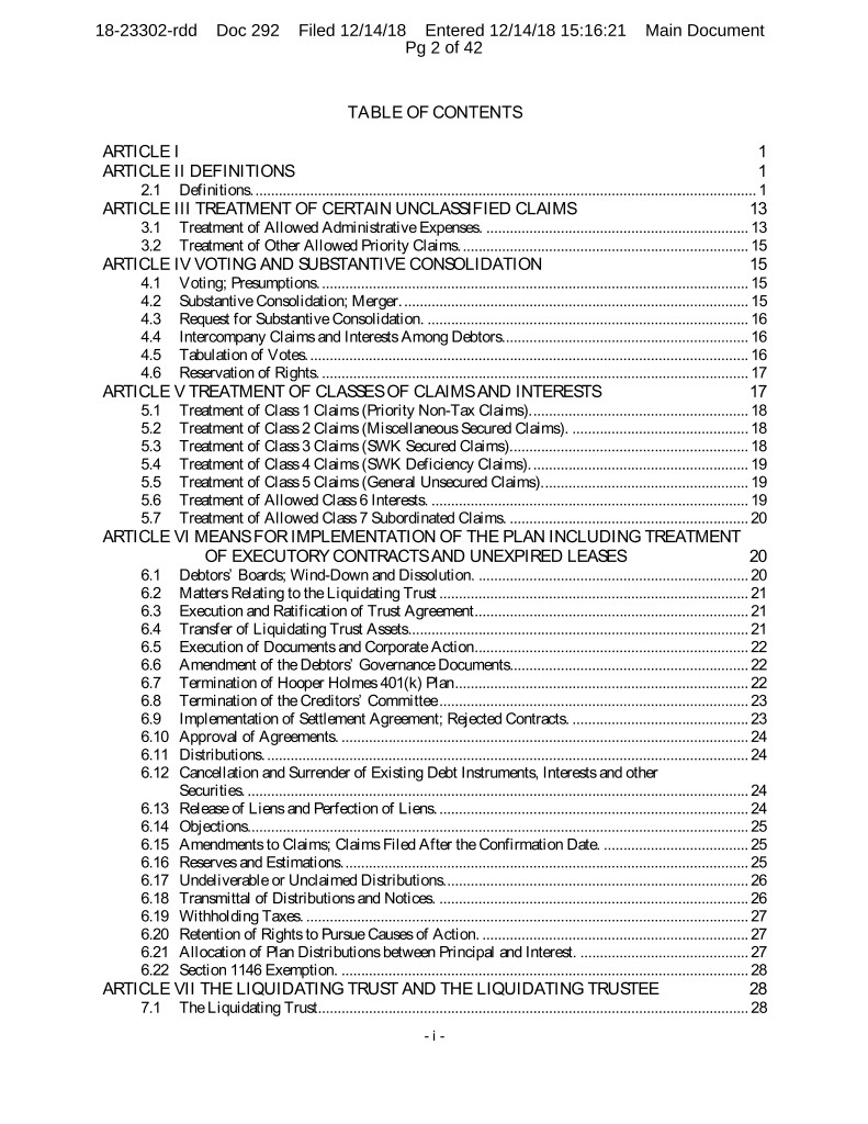18-23302-rdd Doc 292 Filed 12/14/18 Entered 12/14/18 15:16:21 Main Document Pg 2 of 42 TABLE OF CONTENTS ARTICLE I 1 ARTICLE II DEFINITIONS 1 2.1 Definitions. ................................................................................................................................ 1 ARTICLE III TREATMENT OF CERTAIN UNCLASSIFIED CLAIMS 13 3.1 Treatment of Allowed Administrative Expenses. ................................................................... 13 3.2 Treatment of Other Allowed Priority Claims. ......................................................................... 15 ARTICLE IV VOTING AND SUBSTANTIVE CONSOLIDATION 15 4.1 Voting; Presumptions. ............................................................................................................. 15 4.2 Substantive Consolidation; Merger. ........................................................................................ 15 4.3 Request for Substantive Consolidation. .................................................................................. 16 4.4 Intercompany Claims and Interests Among Debtors. .............................................................. 16 4.5 Tabulation of Votes. ................................................................................................................ 16 4.6 Reservation of Rights. ............................................................................................................. 17 ARTICLE V TREATMENT OF CLASSES OF CLAIMS AND INTERESTS 17 5.1 Treatment of Class 1 Claims (Priority Non-Tax Claims). ....................................................... 18 5.2 Treatment of Class 2 Claims (Miscellaneous Secured Claims). ............................................. 18 5.3 Treatment of Class 3 Claims (SWK Secured Claims). ............................................................ 18 5.4 Treatment of Class 4 Claims (SWK Deficiency Claims). ....................................................... 19 5.5 Treatment of Class 5 Claims (General Unsecured Claims). .................................................... 19 5.6 Treatment of Allowed Class 6 Interests. ................................................................................. 19 5.7 Treatment of Allowed Class 7 Subordinated Claims. ............................................................. 20 ARTICLE VI MEANS FOR IMPLEMENTATION OF THE PLAN INCLUDING TREATMENT OF EXECUTORY CONTRACTS AND UNEXPIRED LEASES 20 6.1 Debtors’ Boards; Wind-Down and Dissolution. ..................................................................... 20 6.2 Matters Relating to the Liquidating Trust ............................................................................... 21 6.3 Execution and Ratification of Trust Agreement ...................................................................... 21 6.4 Transfer of Liquidating Trust Assets ....................................................................................... 21 6.5 Execution of Documents and Corporate Action ...................................................................... 22 6.6 Amendment of the Debtors’ Governance Documents ............................................................. 22 6.7 Termination of Hooper Holmes 401(k) Plan ........................................................................... 22 6.8 Termination of the Creditors’ Committee ............................................................................... 23 6.9 Implementation of Settlement Agreement; Rejected Contracts. ............................................. 23 6.10 Approval of Agreements. ........................................................................................................ 24 6.11 Distributions. ........................................................................................................................... 24 6.12 Cancellation and Surrender of Existing Debt Instruments, Interests and other Securities. ................................................................................................................................ 24 6.13 Release of Liens and Perfection of Liens. ............................................................................... 24 6.14 Objections. ............................................................................................................................... 25 6.15 Amendments to Claims; Claims Filed After the Confirmation Date. ..................................... 25 6.16 Reserves and Estimations. ....................................................................................................... 25 6.17 Undeliverable or Unclaimed Distributions. ............................................................................. 26 6.18 Transmittal of Distributions and Notices. ............................................................................... 26 6.19 Withholding Taxes. ................................................................................................................. 27 6.20 Retention of Rights to Pursue Causes of Action. .................................................................... 27 6.21 Allocation of Plan Distributions between Principal and Interest. ........................................... 27 6.22 Section 1146 Exemption. ........................................................................................................ 28 ARTICLE VII THE LIQUIDATING TRUST AND THE LIQUIDATING TRUSTEE 28 7.1 The Liquidating Trust .............................................................................................................. 28 - i -