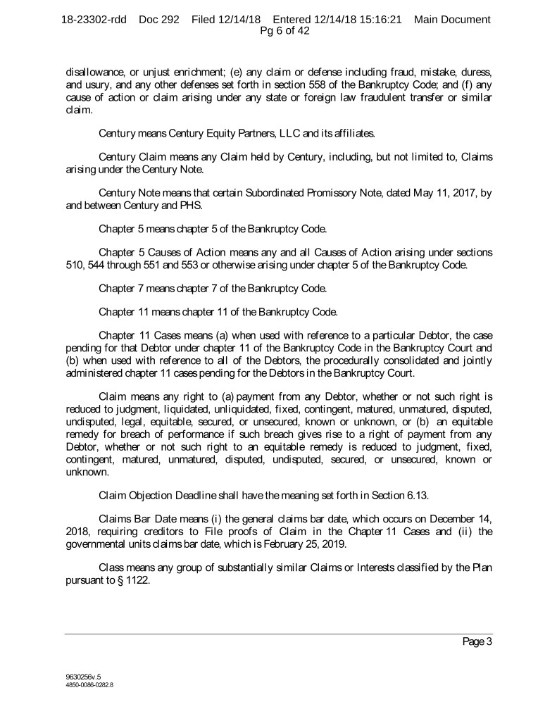 18-23302-rdd Doc 292 Filed 12/14/18 Entered 12/14/18 15:16:21 Main Document Pg 6 of 42 disallowance, or unjust enrichment; (e) any claim or defense including fraud, mistake, duress, and usury, and any other defenses set forth in section 558 of the Bankruptcy Code; and (f) any cause of action or claim arising under any state or foreign law fraudulent transfer or similar claim. Century means Century Equity Partners, LLC and its affiliates. Century Claim means any Claim held by Century, including, but not limited to, Claims arising under the Century Note. Century Note means that certain Subordinated Promissory Note, dated May 11, 2017, by and between Century and PHS. Chapter 5 means chapter 5 of the Bankruptcy Code. Chapter 5 Causes of Action means any and all Causes of Action arising under sections 510, 544 through 551 and 553 or otherwise arising under chapter 5 of the Bankruptcy Code. Chapter 7 means chapter 7 of the Bankruptcy Code. Chapter 11 means chapter 11 of the Bankruptcy Code. Chapter 11 Cases means (a) when used with reference to a particular Debtor, the case pending for that Debtor under chapter 11 of the Bankruptcy Code in the Bankruptcy Court and (b) when used with reference to all of the Debtors, the procedurally consolidated and jointly administered chapter 11 cases pending for the Debtors in the Bankruptcy Court. Claim means any right to (a) payment from any Debtor, whether or not such right is reduced to judgment, liquidated, unliquidated, fixed, contingent, matured, unmatured, disputed, undisputed, legal, equitable, secured, or unsecured, known or unknown, or (b) an equitable remedy for breach of performance if such breach gives rise to a right of payment from any Debtor, whether or not such right to an equitable remedy is reduced to judgment, fixed, contingent, matured, unmatured, disputed, undisputed, secured, or unsecured, known or unknown. Claim Objection Deadline shall have the meaning set forth in Section 6.13. Claims Bar Date means (i) the general claims bar date, which occurs on December 14, 2018, requiring creditors to File proofs of Claim in the Chapter 11 Cases and (ii) the governmental units claims bar date, which is February 25, 2019. Class means any group of substantially similar Claims or Interests classified by the Plan pursuant to § 1122. Page 3 9630256v.5 4850-0086-0282.8