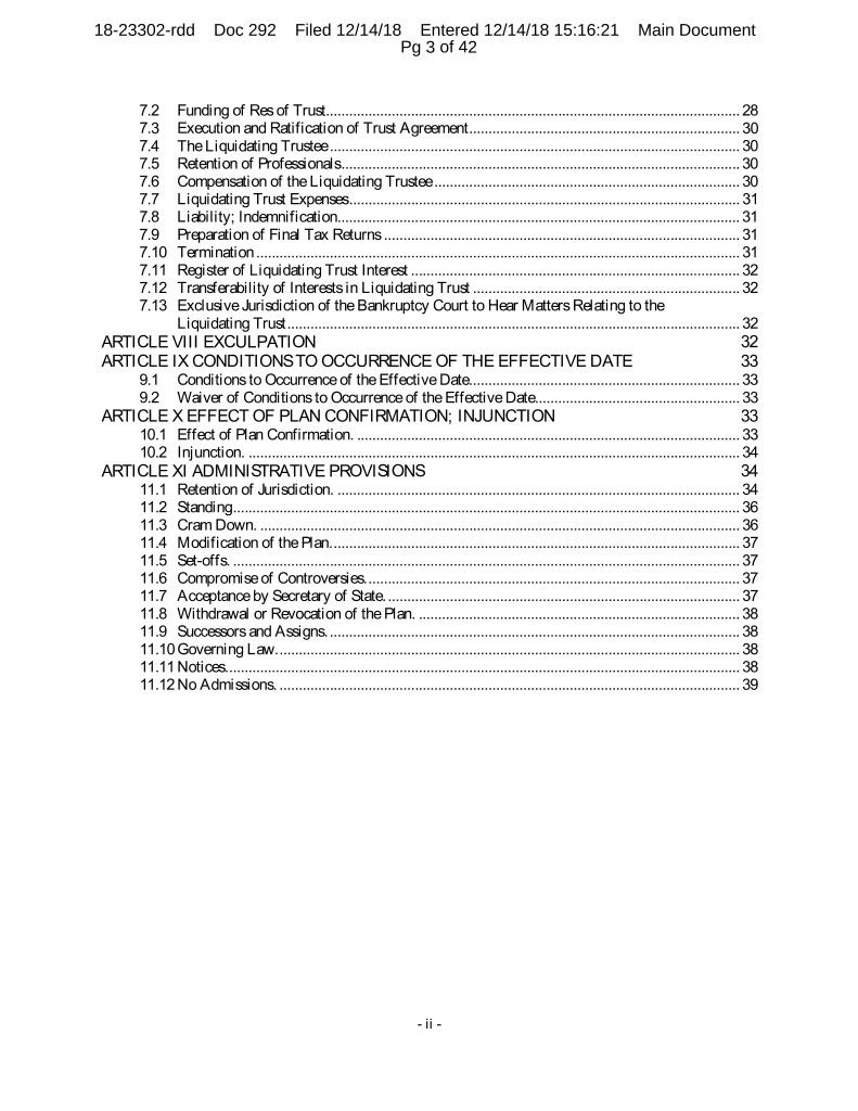 18-23302-rdd Doc 292 Filed 12/14/18 Entered 12/14/18 15:16:21 Main Document Pg 3 of 42 7.2 Funding of Res of Trust ........................................................................................................... 28 7.3 Execution and Ratification of Trust Agreement ...................................................................... 30 7.4 The Liquidating Trustee .......................................................................................................... 30 7.5 Retention of Professionals ....................................................................................................... 30 7.6 Compensation of the Liquidating Trustee ............................................................................... 30 7.7 Liquidating Trust Expenses ..................................................................................................... 31 7.8 Liability; Indemnification ........................................................................................................ 31 7.9 Preparation of Final Tax Returns ............................................................................................ 31 7.10 Termination ............................................................................................................................. 31 7.11 Register of Liquidating Trust Interest ..................................................................................... 32 7.12 Transferability of Interests in Liquidating Trust ..................................................................... 32 7.13 Exclusive Jurisdiction of the Bankruptcy Court to Hear Matters Relating to the Liquidating Trust ..................................................................................................................... 32 ARTICLE VIII EXCULPATION 32 ARTICLE IX CONDITIONS TO OCCURRENCE OF THE EFFECTIVE DATE 33 9.1 Conditions to Occurrence of the Effective Date. ..................................................................... 33 9.2 Waiver of Conditions to Occurrence of the Effective Date. .................................................... 33 ARTICLE X EFFECT OF PLAN CONFIRMATION; INJUNCTION 33 10.1 Effect of Plan Confirmation. ................................................................................................... 33 10.2 Injunction. ............................................................................................................................... 34 ARTICLE XI ADMINISTRATIVE PROVISIONS 34 11.1 Retention of Jurisdiction. ........................................................................................................ 34 11.2 Standing ................................................................................................................................... 36 11.3 Cram Down. ............................................................................................................................ 36 11.4 Modification of the Plan. ......................................................................................................... 37 11.5 Set-offs. ................................................................................................................................... 37 11.6 Compromise of Controversies. ................................................................................................ 37 11.7 Acceptance by Secretary of State. ........................................................................................... 37 11.8 Withdrawal or Revocation of the Plan. ................................................................................... 38 11.9 Successors and Assigns. .......................................................................................................... 38 11.10 Governing Law. ....................................................................................................................... 38 11.11 Notices. .................................................................................................................................... 38 11.12 No Admissions. ....................................................................................................................... 39 - ii -