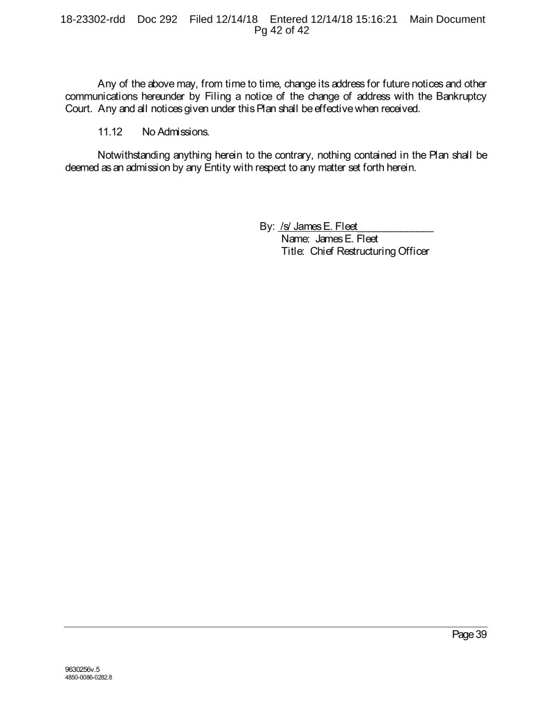 18-23302-rdd Doc 292 Filed 12/14/18 Entered 12/14/18 15:16:21 Main Document Pg 42 of 42 Any of the above may, from time to time, change its address for future notices and other communications hereunder by Filing a notice of the change of address with the Bankruptcy Court. Any and all notices given under this Plan shall be effective when received. 11.12 No Admissions. Notwithstanding anything herein to the contrary, nothing contained in the Plan shall be deemed as an admission by any Entity with respect to any matter set forth herein. By: /s/ James E. Fleet______________ Name: James E. Fleet Title: Chief Restructuring Officer Page 39 9630256v.5 4850-0086-0282.8