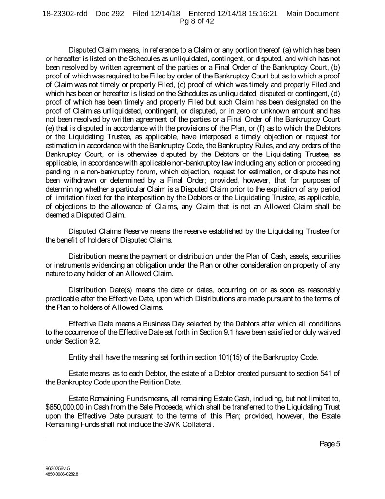 18-23302-rdd Doc 292 Filed 12/14/18 Entered 12/14/18 15:16:21 Main Document Pg 8 of 42 Disputed Claim means, in reference to a Claim or any portion thereof (a) which has been or hereafter is listed on the Schedules as unliquidated, contingent, or disputed, and which has not been resolved by written agreement of the parties or a Final Order of the Bankruptcy Court, (b) proof of which was required to be Filed by order of the Bankruptcy Court but as to which a proof of Claim was not timely or properly Filed, (c) proof of which was timely and properly Filed and which has been or hereafter is listed on the Schedules as unliquidated, disputed or contingent, (d) proof of which has been timely and properly Filed but such Claim has been designated on the proof of Claim as unliquidated, contingent, or disputed, or in zero or unknown amount and has not been resolved by written agreement of the parties or a Final Order of the Bankruptcy Court (e) that is disputed in accordance with the provisions of the Plan, or (f) as to which the Debtors or the Liquidating Trustee, as applicable, have interposed a timely objection or request for estimation in accordance with the Bankruptcy Code, the Bankruptcy Rules, and any orders of the Bankruptcy Court, or is otherwise disputed by the Debtors or the Liquidating Trustee, as applicable, in accordance with applicable non-bankruptcy law including any action or proceeding pending in a non-bankruptcy forum, which objection, request for estimation, or dispute has not been withdrawn or determined by a Final Order; provided, however, that for purposes of determining whether a particular Claim is a Disputed Claim prior to the expiration of any period of limitation fixed for the interposition by the Debtors or the Liquidating Trustee, as applicable, of objections to the allowance of Claims, any Claim that is not an Allowed Claim shall be deemed a Disputed Claim. Disputed Claims Reserve means the reserve established by the Liquidating Trustee for the benefit of holders of Disputed Claims. Distribution means the payment or distribution under the Plan of Cash, assets, securities or instruments evidencing an obligation under the Plan or other consideration on property of any nature to any holder of an Allowed Claim. Distribution Date(s) means the date or dates, occurring on or as soon as reasonably practicable after the Effective Date, upon which Distributions are made pursuant to the terms of the Plan to holders of Allowed Claims. Effective Date means a Business Day selected by the Debtors after which all conditions to the occurrence of the Effective Date set forth in Section 9.1 have been satisfied or duly waived under Section 9.2. Entity shall have the meaning set forth in section 101(15) of the Bankruptcy Code. Estate means, as to each Debtor, the estate of a Debtor created pursuant to section 541 of the Bankruptcy Code upon the Petition Date. Estate Remaining Funds means, all remaining Estate Cash, including, but not limited to, $650,000.00 in Cash from the Sale Proceeds, which shall be transferred to the Liquidating Trust upon the Effective Date pursuant to the terms of this Plan; provided, however, the Estate Remaining Funds shall not include the SWK Collateral. Page 5 9630256v.5 4850-0086-0282.8