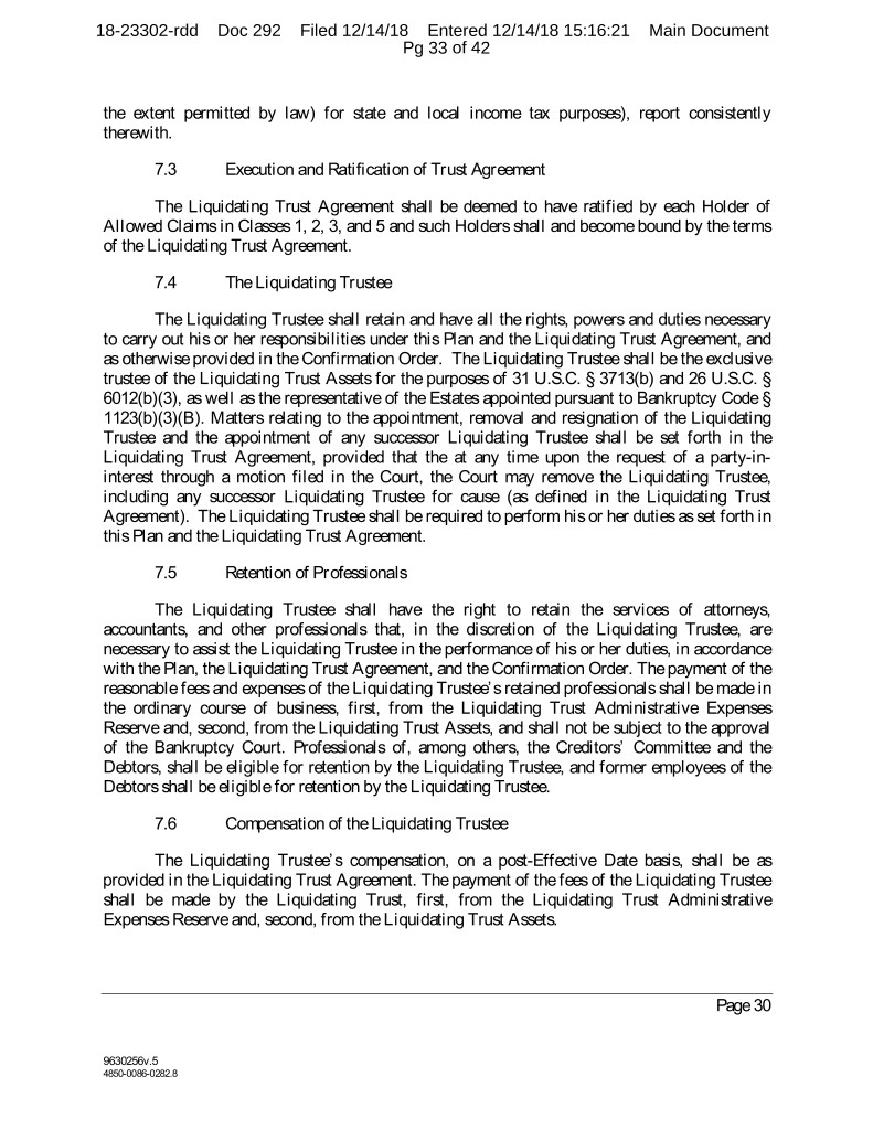 18-23302-rdd Doc 292 Filed 12/14/18 Entered 12/14/18 15:16:21 Main Document Pg 33 of 42 the extent permitted by law) for state and local income tax purposes), report consistently therewith. 7.3 Execution and Ratification of Trust Agreement The Liquidating Trust Agreement shall be deemed to have ratified by each Holder of Allowed Claims in Classes 1, 2, 3, and 5 and such Holders shall and become bound by the terms of the Liquidating Trust Agreement. 7.4 The Liquidating Trustee The Liquidating Trustee shall retain and have all the rights, powers and duties necessary to carry out his or her responsibilities under this Plan and the Liquidating Trust Agreement, and as otherwise provided in the Confirmation Order. The Liquidating Trustee shall be the exclusive trustee of the Liquidating Trust Assets for the purposes of 31 U.S.C. § 3713(b) and 26 U.S.C. § 6012(b)(3), as well as the representative of the Estates appointed pursuant to Bankruptcy Code § 1123(b)(3)(B). Matters relating to the appointment, removal and resignation of the Liquidating Trustee and the appointment of any successor Liquidating Trustee shall be set forth in the Liquidating Trust Agreement, provided that the at any time upon the request of a party-in- interest through a motion filed in the Court, the Court may remove the Liquidating Trustee, including any successor Liquidating Trustee for cause (as defined in the Liquidating Trust Agreement). The Liquidating Trustee shall be required to perform his or her duties as set forth in this Plan and the Liquidating Trust Agreement. 7.5 Retention of Professionals The Liquidating Trustee shall have the right to retain the services of attorneys, accountants, and other professionals that, in the discretion of the Liquidating Trustee, are necessary to assist the Liquidating Trustee in the performance of his or her duties, in accordance with the Plan, the Liquidating Trust Agreement, and the Confirmation Order. The payment of the reasonable fees and expenses of the Liquidating Trustee’s retained professionals shall be made in the ordinary course of business, first, from the Liquidating Trust Administrative Expenses Reserve and, second, from the Liquidating Trust Assets, and shall not be subject to the approval of the Bankruptcy Court. Professionals of, among others, the Creditors’ Committee and the Debtors, shall be eligible for retention by the Liquidating Trustee, and former employees of the Debtors shall be eligible for retention by the Liquidating Trustee. 7.6 Compensation of the Liquidating Trustee The Liquidating Trustee’s compensation, on a post-Effective Date basis, shall be as provided in the Liquidating Trust Agreement. The payment of the fees of the Liquidating Trustee shall be made by the Liquidating Trust, first, from the Liquidating Trust Administrative Expenses Reserve and, second, from the Liquidating Trust Assets. Page 30 9630256v.5 4850-0086-0282.8