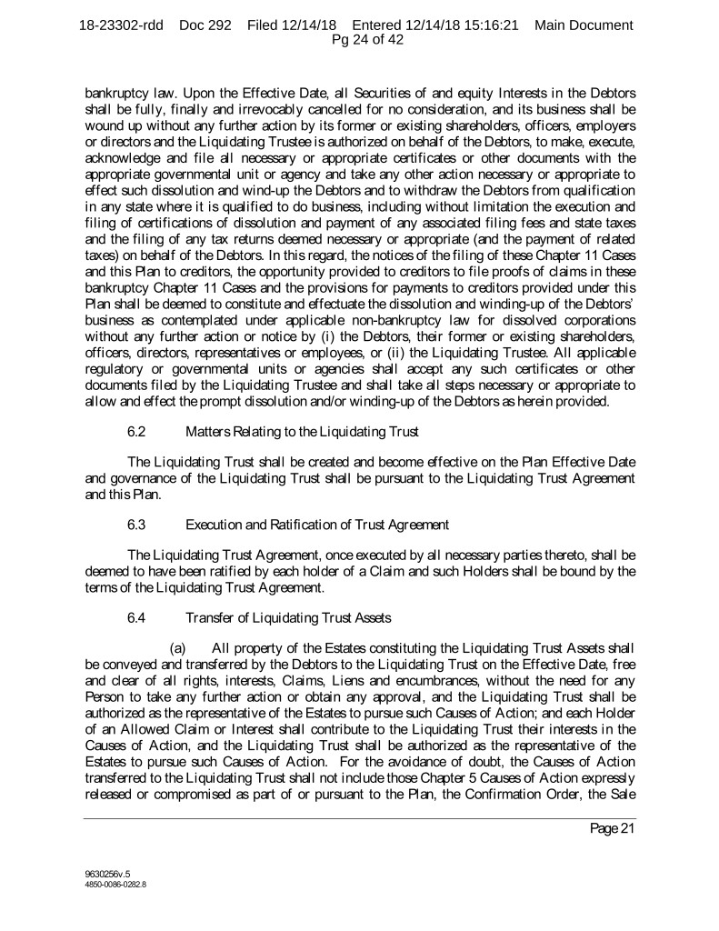 18-23302-rdd Doc 292 Filed 12/14/18 Entered 12/14/18 15:16:21 Main Document Pg 24 of 42 bankruptcy law. Upon the Effective Date, all Securities of and equity Interests in the Debtors shall be fully, finally and irrevocably cancelled for no consideration, and its business shall be wound up without any further action by its former or existing shareholders, officers, employers or directors and the Liquidating Trustee is authorized on behalf of the Debtors, to make, execute, acknowledge and file all necessary or appropriate certificates or other documents with the appropriate governmental unit or agency and take any other action necessary or appropriate to effect such dissolution and wind-up the Debtors and to withdraw the Debtors from qualification in any state where it is qualified to do business, including without limitation the execution and filing of certifications of dissolution and payment of any associated filing fees and state taxes and the filing of any tax returns deemed necessary or appropriate (and the payment of related taxes) on behalf of the Debtors. In this regard, the notices of the filing of these Chapter 11 Cases and this Plan to creditors, the opportunity provided to creditors to file proofs of claims in these bankruptcy Chapter 11 Cases and the provisions for payments to creditors provided under this Plan shall be deemed to constitute and effectuate the dissolution and winding-up of the Debtors’ business as contemplated under applicable non-bankruptcy law for dissolved corporations without any further action or notice by (i) the Debtors, their former or existing shareholders, officers, directors, representatives or employees, or (ii) the Liquidating Trustee. All applicable regulatory or governmental units or agencies shall accept any such certificates or other documents filed by the Liquidating Trustee and shall take all steps necessary or appropriate to allow and effect the prompt dissolution and/or winding-up of the Debtors as herein provided. 6.2 Matters Relating to the Liquidating Trust The Liquidating Trust shall be created and become effective on the Plan Effective Date and governance of the Liquidating Trust shall be pursuant to the Liquidating Trust Agreement and this Plan. 6.3 Execution and Ratification of Trust Agreement The Liquidating Trust Agreement, once executed by all necessary parties thereto, shall be deemed to have been ratified by each holder of a Claim and such Holders shall be bound by the terms of the Liquidating Trust Agreement. 6.4 Transfer of Liquidating Trust Assets (a) All property of the Estates constituting the Liquidating Trust Assets shall be conveyed and transferred by the Debtors to the Liquidating Trust on the Effective Date, free and clear of all rights, interests, Claims, Liens and encumbrances, without the need for any Person to take any further action or obtain any approval, and the Liquidating Trust shall be authorized as the representative of the Estates to pursue such Causes of Action; and each Holder of an Allowed Claim or Interest shall contribute to the Liquidating Trust their interests in the Causes of Action, and the Liquidating Trust shall be authorized as the representative of the Estates to pursue such Causes of Action. For the avoidance of doubt, the Causes of Action transferred to the Liquidating Trust shall not include those Chapter 5 Causes of Action expressly released or compromised as part of or pursuant to the Plan, the Confirmation Order, the Sale Page 21 9630256v.5 4850-0086-0282.8