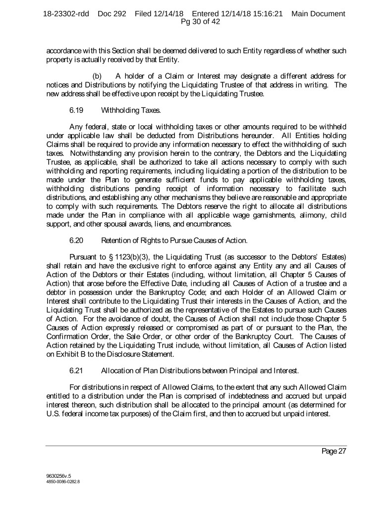 18-23302-rdd Doc 292 Filed 12/14/18 Entered 12/14/18 15:16:21 Main Document Pg 30 of 42 accordance with this Section shall be deemed delivered to such Entity regardless of whether such property is actually received by that Entity. (b) A holder of a Claim or Interest may designate a different address for notices and Distributions by notifying the Liquidating Trustee of that address in writing. The new address shall be effective upon receipt by the Liquidating Trustee. 6.19 Withholding Taxes. Any federal, state or local withholding taxes or other amounts required to be withheld under applicable law shall be deducted from Distributions hereunder. All Entities holding Claims shall be required to provide any information necessary to effect the withholding of such taxes. Notwithstanding any provision herein to the contrary, the Debtors and the Liquidating Trustee, as applicable, shall be authorized to take all actions necessary to comply with such withholding and reporting requirements, including liquidating a portion of the distribution to be made under the Plan to generate sufficient funds to pay applicable withholding taxes, withholding distributions pending receipt of information necessary to facilitate such distributions, and establishing any other mechanisms they believe are reasonable and appropriate to comply with such requirements. The Debtors reserve the right to allocate all distributions made under the Plan in compliance with all applicable wage garnishments, alimony, child support, and other spousal awards, liens, and encumbrances. 6.20 Retention of Rights to Pursue Causes of Action. Pursuant to § 1123(b)(3), the Liquidating Trust (as successor to the Debtors’ Estates) shall retain and have the exclusive right to enforce against any Entity any and all Causes of Action of the Debtors or their Estates (including, without limitation, all Chapter 5 Causes of Action) that arose before the Effective Date, including all Causes of Action of a trustee and a debtor in possession under the Bankruptcy Code; and each Holder of an Allowed Claim or Interest shall contribute to the Liquidating Trust their interests in the Causes of Action, and the Liquidating Trust shall be authorized as the representative of the Estates to pursue such Causes of Action. For the avoidance of doubt, the Causes of Action shall not include those Chapter 5 Causes of Action expressly released or compromised as part of or pursuant to the Plan, the Confirmation Order, the Sale Order, or other order of the Bankruptcy Court. The Causes of Action retained by the Liquidating Trust include, without limitation, all Causes of Action listed on Exhibit B to the Disclosure Statement. 6.21 Allocation of Plan Distributions between Principal and Interest. For distributions in respect of Allowed Claims, to the extent that any such Allowed Claim entitled to a distribution under the Plan is comprised of indebtedness and accrued but unpaid interest thereon, such distribution shall be allocated to the principal amount (as determined for U.S. federal income tax purposes) of the Claim first, and then to accrued but unpaid interest. Page 27 9630256v.5 4850-0086-0282.8