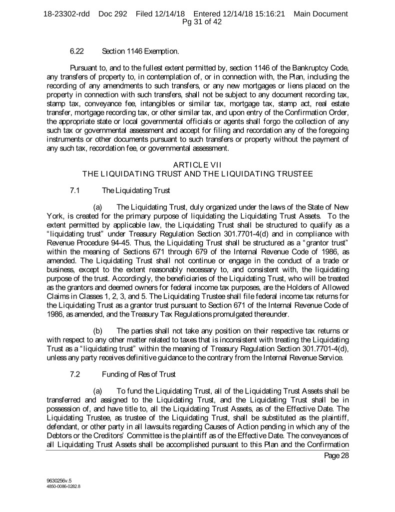 18-23302-rdd Doc 292 Filed 12/14/18 Entered 12/14/18 15:16:21 Main Document Pg 31 of 42 6.22 Section 1146 Exemption. Pursuant to, and to the fullest extent permitted by, section 1146 of the Bankruptcy Code, any transfers of property to, in contemplation of, or in connection with, the Plan, including the recording of any amendments to such transfers, or any new mortgages or liens placed on the property in connection with such transfers, shall not be subject to any document recording tax, stamp tax, conveyance fee, intangibles or similar tax, mortgage tax, stamp act, real estate transfer, mortgage recording tax, or other similar tax, and upon entry of the Confirmation Order, the appropriate state or local governmental officials or agents shall forgo the collection of any such tax or governmental assessment and accept for filing and recordation any of the foregoing instruments or other documents pursuant to such transfers or property without the payment of any such tax, recordation fee, or governmental assessment. ARTICLE VII THE LIQUIDATING TRUST AND THE LIQUIDATING TRUSTEE 7.1 The Liquidating Trust (a) The Liquidating Trust, duly organized under the laws of the State of New York, is created for the primary purpose of liquidating the Liquidating Trust Assets. To the extent permitted by applicable law, the Liquidating Trust shall be structured to qualify as a “liquidating trust” under Treasury Regulation Section 301.7701-4(d) and in compliance with Revenue Procedure 94-45. Thus, the Liquidating Trust shall be structured as a “grantor trust” within the meaning of Sections 671 through 679 of the Internal Revenue Code of 1986, as amended. The Liquidating Trust shall not continue or engage in the conduct of a trade or business, except to the extent reasonably necessary to, and consistent with, the liquidating purpose of the trust. Accordingly, the beneficiaries of the Liquidating Trust, who will be treated as the grantors and deemed owners for federal income tax purposes, are the Holders of Allowed Claims in Classes 1, 2, 3, and 5. The Liquidating Trustee shall file federal income tax returns for the Liquidating Trust as a grantor trust pursuant to Section 671 of the Internal Revenue Code of 1986, as amended, and the Treasury Tax Regulations promulgated thereunder. (b) The parties shall not take any position on their respective tax returns or with respect to any other matter related to taxes that is inconsistent with treating the Liquidating Trust as a “liquidating trust” within the meaning of Treasury Regulation Section 301.7701-4(d), unless any party receives definitive guidance to the contrary from the Internal Revenue Service. 7.2 Funding of Res of Trust (a) To fund the Liquidating Trust, all of the Liquidating Trust Assets shall be transferred and assigned to the Liquidating Trust, and the Liquidating Trust shall be in possession of, and have title to, all the Liquidating Trust Assets, as of the Effective Date. The Liquidating Trustee, as trustee of the Liquidating Trust, shall be substituted as the plaintiff, defendant, or other party in all lawsuits regarding Causes of Action pending in which any of the Debtors or the Creditors’ Committee is the plaintiff as of the Effective Date. The conveyances of all Liquidating Trust Assets shall be accomplished pursuant to this Plan and the Confirmation Page 28 9630256v.5 4850-0086-0282.8