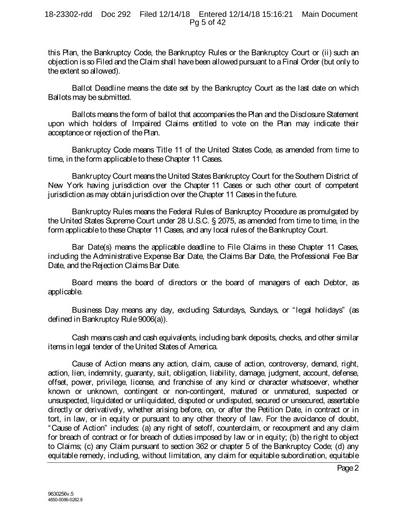 18-23302-rdd Doc 292 Filed 12/14/18 Entered 12/14/18 15:16:21 Main Document Pg 5 of 42 this Plan, the Bankruptcy Code, the Bankruptcy Rules or the Bankruptcy Court or (ii) such an objection is so Filed and the Claim shall have been allowed pursuant to a Final Order (but only to the extent so allowed). Ballot Deadline means the date set by the Bankruptcy Court as the last date on which Ballots may be submitted. Ballots means the form of ballot that accompanies the Plan and the Disclosure Statement upon which holders of Impaired Claims entitled to vote on the Plan may indicate their acceptance or rejection of the Plan. Bankruptcy Code means Title 11 of the United States Code, as amended from time to time, in the form applicable to these Chapter 11 Cases. Bankruptcy Court means the United States Bankruptcy Court for the Southern District of New York having jurisdiction over the Chapter 11 Cases or such other court of competent jurisdiction as may obtain jurisdiction over the Chapter 11 Cases in the future. Bankruptcy Rules means the Federal Rules of Bankruptcy Procedure as promulgated by the United States Supreme Court under 28 U.S.C. § 2075, as amended from time to time, in the form applicable to these Chapter 11 Cases, and any local rules of the Bankruptcy Court. Bar Date(s) means the applicable deadline to File Claims in these Chapter 11 Cases, including the Administrative Expense Bar Date, the Claims Bar Date, the Professional Fee Bar Date, and the Rejection Claims Bar Date. Board means the board of directors or the board of managers of each Debtor, as applicable. Business Day means any day, excluding Saturdays, Sundays, or “legal holidays” (as defined in Bankruptcy Rule 9006(a)). Cash means cash and cash equivalents, including bank deposits, checks, and other similar items in legal tender of the United States of America. Cause of Action means any action, claim, cause of action, controversy, demand, right, action, lien, indemnity, guaranty, suit, obligation, liability, damage, judgment, account, defense, offset, power, privilege, license, and franchise of any kind or character whatsoever, whether known or unknown, contingent or non-contingent, matured or unmatured, suspected or unsuspected, liquidated or unliquidated, disputed or undisputed, secured or unsecured, assertable directly or derivatively, whether arising before, on, or after the Petition Date, in contract or in tort, in law, or in equity or pursuant to any other theory of law. For the avoidance of doubt, “Cause of Action” includes: (a) any right of setoff, counterclaim, or recoupment and any claim for breach of contract or for breach of duties imposed by law or in equity; (b) the right to object to Claims; (c) any Claim pursuant to section 362 or chapter 5 of the Bankruptcy Code; (d) any equitable remedy, including, without limitation, any claim for equitable subordination, equitable Page 2 9630256v.5 4850-0086-0282.8