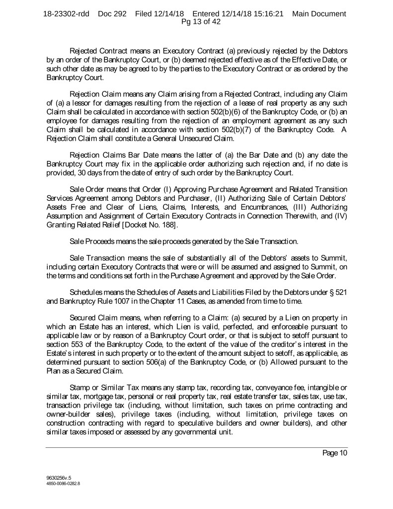 18-23302-rdd Doc 292 Filed 12/14/18 Entered 12/14/18 15:16:21 Main Document Pg 13 of 42 Rejected Contract means an Executory Contract (a) previously rejected by the Debtors by an order of the Bankruptcy Court, or (b) deemed rejected effective as of the Effective Date, or such other date as may be agreed to by the parties to the Executory Contract or as ordered by the Bankruptcy Court. Rejection Claim means any Claim arising from a Rejected Contract, including any Claim of (a) a lessor for damages resulting from the rejection of a lease of real property as any such Claim shall be calculated in accordance with section 502(b)(6) of the Bankruptcy Code, or (b) an employee for damages resulting from the rejection of an employment agreement as any such Claim shall be calculated in accordance with section 502(b)(7) of the Bankruptcy Code. A Rejection Claim shall constitute a General Unsecured Claim. Rejection Claims Bar Date means the latter of (a) the Bar Date and (b) any date the Bankruptcy Court may fix in the applicable order authorizing such rejection and, if no date is provided, 30 days from the date of entry of such order by the Bankruptcy Court. Sale Order means that Order (I) Approving Purchase Agreement and Related Transition Services Agreement among Debtors and Purchaser, (II) Authorizing Sale of Certain Debtors’ Assets Free and Clear of Liens, Claims, Interests, and Encumbrances, (III) Authorizing Assumption and Assignment of Certain Executory Contracts in Connection Therewith, and (IV) Granting Related Relief [Docket No. 188]. Sale Proceeds means the sale proceeds generated by the Sale Transaction. Sale Transaction means the sale of substantially all of the Debtors’ assets to Summit, including certain Executory Contracts that were or will be assumed and assigned to Summit, on the terms and conditions set forth in the Purchase Agreement and approved by the Sale Order. Schedules means the Schedules of Assets and Liabilities Filed by the Debtors under § 521 and Bankruptcy Rule 1007 in the Chapter 11 Cases, as amended from time to time. Secured Claim means, when referring to a Claim: (a) secured by a Lien on property in which an Estate has an interest, which Lien is valid, perfected, and enforceable pursuant to applicable law or by reason of a Bankruptcy Court order, or that is subject to setoff pursuant to section 553 of the Bankruptcy Code, to the extent of the value of the creditor’s interest in the Estate’s interest in such property or to the extent of the amount subject to setoff, as applicable, as determined pursuant to section 506(a) of the Bankruptcy Code, or (b) Allowed pursuant to the Plan as a Secured Claim. Stamp or Similar Tax means any stamp tax, recording tax, conveyance fee, intangible or similar tax, mortgage tax, personal or real property tax, real estate transfer tax, sales tax, use tax, transaction privilege tax (including, without limitation, such taxes on prime contracting and owner-builder sales), privilege taxes (including, without limitation, privilege taxes on construction contracting with regard to speculative builders and owner builders), and other similar taxes imposed or assessed by any governmental unit. Page 10 9630256v.5 4850-0086-0282.8