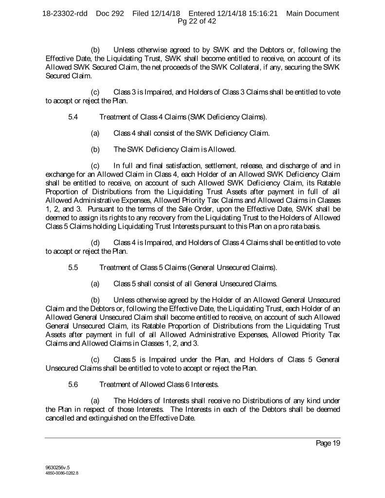 18-23302-rdd Doc 292 Filed 12/14/18 Entered 12/14/18 15:16:21 Main Document Pg 22 of 42 (b) Unless otherwise agreed to by SWK and the Debtors or, following the Effective Date, the Liquidating Trust, SWK shall become entitled to receive, on account of its Allowed SWK Secured Claim, the net proceeds of the SWK Collateral, if any, securing the SWK Secured Claim. (c) Class 3 is Impaired, and Holders of Class 3 Claims shall be entitled to vote to accept or reject the Plan. 5.4 Treatment of Class 4 Claims (SWK Deficiency Claims). (a) Class 4 shall consist of the SWK Deficiency Claim. (b) The SWK Deficiency Claim is Allowed. (c) In full and final satisfaction, settlement, release, and discharge of and in exchange for an Allowed Claim in Class 4, each Holder of an Allowed SWK Deficiency Claim shall be entitled to receive, on account of such Allowed SWK Deficiency Claim, its Ratable Proportion of Distributions from the Liquidating Trust Assets after payment in full of all Allowed Administrative Expenses, Allowed Priority Tax Claims and Allowed Claims in Classes 1, 2, and 3. Pursuant to the terms of the Sale Order, upon the Effective Date, SWK shall be deemed to assign its rights to any recovery from the Liquidating Trust to the Holders of Allowed Class 5 Claims holding Liquidating Trust Interests pursuant to this Plan on a pro rata basis. (d) Class 4 is Impaired, and Holders of Class 4 Claims shall be entitled to vote to accept or reject the Plan. 5.5 Treatment of Class 5 Claims (General Unsecured Claims). (a) Class 5 shall consist of all General Unsecured Claims. (b) Unless otherwise agreed by the Holder of an Allowed General Unsecured Claim and the Debtors or, following the Effective Date, the Liquidating Trust, each Holder of an Allowed General Unsecured Claim shall become entitled to receive, on account of such Allowed General Unsecured Claim, its Ratable Proportion of Distributions from the Liquidating Trust Assets after payment in full of all Allowed Administrative Expenses, Allowed Priority Tax Claims and Allowed Claims in Classes 1, 2, and 3. (c) Class 5 is Impaired under the Plan, and Holders of Class 5 General Unsecured Claims shall be entitled to vote to accept or reject the Plan. 5.6 Treatment of Allowed Class 6 Interests. (a) The Holders of Interests shall receive no Distributions of any kind under the Plan in respect of those Interests. The Interests in each of the Debtors shall be deemed cancelled and extinguished on the Effective Date. Page 19 9630256v.5 4850-0086-0282.8