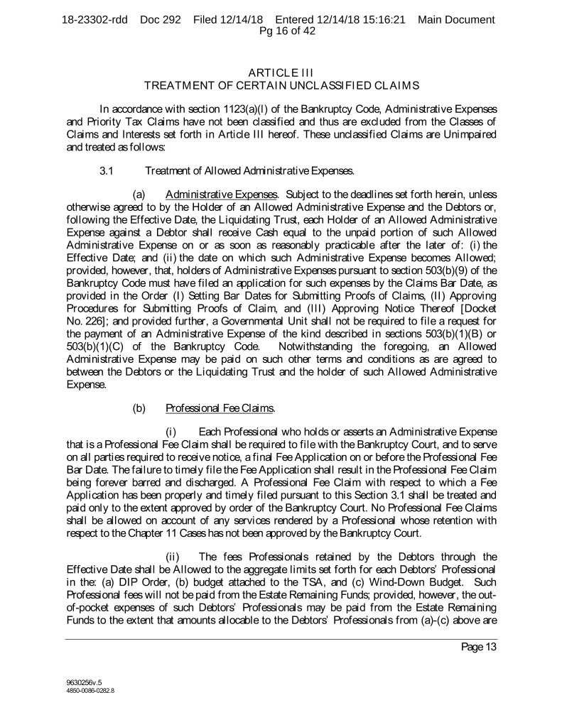 18-23302-rdd Doc 292 Filed 12/14/18 Entered 12/14/18 15:16:21 Main Document Pg 16 of 42 ARTICLE III TREATMENT OF CERTAIN UNCLASSIFIED CLAIMS In accordance with section 1123(a)(l) of the Bankruptcy Code, Administrative Expenses and Priority Tax Claims have not been classified and thus are excluded from the Classes of Claims and Interests set forth in Article III hereof. These unclassified Claims are Unimpaired and treated as follows: 3.1 Treatment of Allowed Administrative Expenses. (a) Administrative Expenses. Subject to the deadlines set forth herein, unless otherwise agreed to by the Holder of an Allowed Administrative Expense and the Debtors or, following the Effective Date, the Liquidating Trust, each Holder of an Allowed Administrative Expense against a Debtor shall receive Cash equal to the unpaid portion of such Allowed Administrative Expense on or as soon as reasonably practicable after the later of: (i) the Effective Date; and (ii) the date on which such Administrative Expense becomes Allowed; provided, however, that, holders of Administrative Expenses pursuant to section 503(b)(9) of the Bankruptcy Code must have filed an application for such expenses by the Claims Bar Date, as provided in the Order (I) Setting Bar Dates for Submitting Proofs of Claims, (II) Approving Procedures for Submitting Proofs of Claim, and (III) Approving Notice Thereof [Docket No. 226]; and provided further, a Governmental Unit shall not be required to file a request for the payment of an Administrative Expense of the kind described in sections 503(b)(1)(B) or 503(b)(1)(C) of the Bankruptcy Code. Notwithstanding the foregoing, an Allowed Administrative Expense may be paid on such other terms and conditions as are agreed to between the Debtors or the Liquidating Trust and the holder of such Allowed Administrative Expense. (b) Professional Fee Claims. (i) Each Professional who holds or asserts an Administrative Expense that is a Professional Fee Claim shall be required to file with the Bankruptcy Court, and to serve on all parties required to receive notice, a final Fee Application on or before the Professional Fee Bar Date. The failure to timely file the Fee Application shall result in the Professional Fee Claim being forever barred and discharged. A Professional Fee Claim with respect to which a Fee Application has been properly and timely filed pursuant to this Section 3.1 shall be treated and paid only to the extent approved by order of the Bankruptcy Court. No Professional Fee Claims shall be allowed on account of any services rendered by a Professional whose retention with respect to the Chapter 11 Cases has not been approved by the Bankruptcy Court. (ii) The fees Professionals retained by the Debtors through the Effective Date shall be Allowed to the aggregate limits set forth for each Debtors’ Professional in the: (a) DIP Order, (b) budget attached to the TSA, and (c) Wind-Down Budget. Such Professional fees will not be paid from the Estate Remaining Funds; provided, however, the out- of-pocket expenses of such Debtors’ Professionals may be paid from the Estate Remaining Funds to the extent that amounts allocable to the Debtors’ Professionals from (a)-(c) above are Page 13 9630256v.5 4850-0086-0282.8