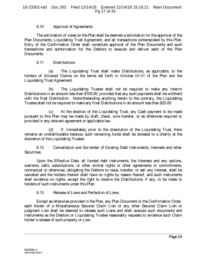 18-23302-rdd Doc 292 Filed 12/14/18 Entered 12/14/18 15:16:21 Main Document Pg 27 of 42 6.10 Approval of Agreements. The solicitation of votes on the Plan shall be deemed a solicitation for the approval of the Plan Documents, Liquidating Trust Agreement, and all transactions contemplated by this Plan. Entry of the Confirmation Order shall constitute approval of the Plan Documents and such transactions and authorization for the Debtors to execute and deliver each of the Plan Documents. 6.11 Distributions. (a) The Liquidating Trust shall make Distributions, as applicable, to the holders of Allowed Claims on the terms set forth in Articles III-VI of the Plan and the Liquidating Trust Agreement. (b) The Liquidating Trustee shall not be required to make any interim Distributions in an amount less than $100.00; provided that any such payments shall be withheld until the final Distribution. Notwithstanding anything herein to the contrary, the Liquidating Trustee shall not be required to make any final Distributions in an amount less than $25.00. (c) At the election of the Liquidating Trust, any Cash payment to be made pursuant to this Plan may be made by draft, check, wire transfer, or as otherwise required or provided in any relevant agreement or applicable law. (d) If, immediately prior to the dissolution of the Liquidating Trust, there remains an undistributable balance, such remaining funds shall be donated to a charity at the discretion of the Liquidating Trustee. 6.12 Cancellation and Surrender of Existing Debt Instruments, Interests and other Securities. Upon the Effective Date, all funded debt instruments, the Interests and any options, warrants, calls, subscriptions, or other similar rights or other agreements or commitments, contractual or otherwise, obligating the Debtors to issue, transfer, or sell any Interest, shall be canceled and the holders thereof shall have no rights by reason thereof, and such instruments shall evidence no rights, except the right to receive the Distributions, if any, to be made to holders of such instruments under this Plan. 6.13 Release of Liens and Perfection of Liens. Except as otherwise provided in the Plan, any Plan Document or the Confirmation Order, each holder of a Miscellaneous Secured Claim Lien or any other Secured Claim Lien or judgment Lien shall be deemed to release such Liens and shall execute such documents and instruments as the Debtors or Liquidating Trustee reasonably requests to evidence such Claim holder’s release of such property or Lien. Page 24 9630256v.5 4850-0086-0282.8