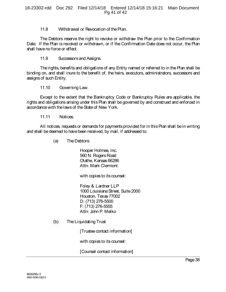 18-23302-rdd Doc 292 Filed 12/14/18 Entered 12/14/18 15:16:21 Main Document Pg 41 of 42 11.8 Withdrawal or Revocation of the Plan. The Debtors reserve the right to revoke or withdraw the Plan prior to the Confirmation Date. If the Plan is revoked or withdrawn, or if the Confirmation Date does not occur, the Plan shall have no force or effect. 11.9 Successors and Assigns. The rights, benefits and obligations of any Entity named or referred to in the Plan shall be binding on, and shall inure to the benefit of, the heirs, executors, administrators, successors and assigns of such Entity. 11.10 Governing Law. Except to the extent that the Bankruptcy Code or Bankruptcy Rules are applicable, the rights and obligations arising under this Plan shall be governed by and construed and enforced in accordance with the laws of the State of New York. 11.11 Notices. All notices, requests or demands for payments provided for in this Plan shall be in writing and shall be deemed to have been received, by mail, if addressed to: (a) The Debtors: Hooper Holmes, Inc. 560 N. Rogers Road Olathe, Kansas 66286 Attn: Mark Clermont with copies to its counsel: Foley & Lardner LLP 1000 Louisiana Street, Suite 2000 Houston, Texas 77002 D: (713) 276-5500 F: (713) 276-5555 Attn: John P. Melko (b) The Liquidating Trust [Trustee contact information] with copies to its counsel: [Counsel contact information] Page 38 9630256v.5 4850-0086-0282.8