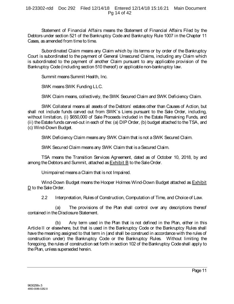 18-23302-rdd Doc 292 Filed 12/14/18 Entered 12/14/18 15:16:21 Main Document Pg 14 of 42 Statement of Financial Affairs means the Statement of Financial Affairs Filed by the Debtors under section 521 of the Bankruptcy Code and Bankruptcy Rule 1007 in the Chapter 11 Cases, as amended from time to time. Subordinated Claim means any Claim which by its terms or by order of the Bankruptcy Court is subordinated to the payment of General Unsecured Claims, including any Claim which is subordinated to the payment of another Claim pursuant to any applicable provision of the Bankruptcy Code (including section 510 thereof) or applicable non-bankruptcy law. Summit means Summit Health, Inc. SWK means SWK Funding LLC. SWK Claim means, collectively, the SWK Secured Claim and SWK Deficiency Claim. SWK Collateral means all assets of the Debtors’ estates other than Causes of Action, but shall not include funds carved out from SWK’s Liens pursuant to the Sale Order, including, without limitation, (i) $650,000 of Sale Proceeds included in the Estate Remaining Funds, and (ii) the Estate funds carved-out in each of the: (a) DIP Order, (b) budget attached to the TSA, and (c) Wind-Down Budget. SWK Deficiency Claim means any SWK Claim that is not a SWK Secured Claim. SWK Secured Claim means any SWK Claim that is a Secured Claim. TSA means the Transition Services Agreement, dated as of October 10, 2018, by and among the Debtors and Summit, attached as Exhibit B to the Sale Order. Unimpaired means a Claim that is not Impaired. Wind-Down Budget means the Hooper Holmes Wind-Down Budget attached as Exhibit D to the Sale Order. 2.2 Interpretation, Rules of Construction, Computation of Time, and Choice of Law. (a) The provisions of the Plan shall control over any descriptions thereof contained in the Disclosure Statement. (b) Any term used in the Plan that is not defined in the Plan, either in this Article II or elsewhere, but that is used in the Bankruptcy Code or the Bankruptcy Rules shall have the meaning assigned to that term in (and shall be construed in accordance with the rules of construction under) the Bankruptcy Code or the Bankruptcy Rules. Without limiting the foregoing, the rules of construction set forth in section 102 of the Bankruptcy Code shall apply to the Plan, unless superseded herein. Page 11 9630256v.5 4850-0086-0282.8