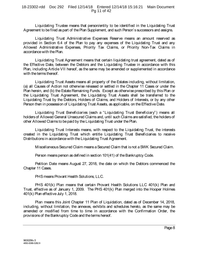 18-23302-rdd Doc 292 Filed 12/14/18 Entered 12/14/18 15:16:21 Main Document Pg 11 of 42 Liquidating Trustee means that person/entity to be identified in the Liquidating Trust Agreement to be filed as part of the Plan Supplement, and such Person’s successors and assigns. Liquidating Trust Administrative Expenses Reserve means an amount reserved as provided in Section 6.4 of the Plan to pay any expenses of the Liquidating Trust and any Allowed Administrative Expenses, Priority Tax Claims, or Priority Non-Tax Claims in accordance with the Plan. Liquidating Trust Agreement means that certain liquidating trust agreement, dated as of the Effective Date, between the Debtors and the Liquidating Trustee in accordance with this Plan, including Article VII hereof, as the same may be amended or supplemented in accordance with the terms thereof. Liquidating Trust Assets means all property of the Estates including, without limitation, (a) all Causes of Action not otherwise released or settled in the Chapter 11 Cases or under the Plan herein, and (b) the Estate Remaining Funds. Except as otherwise prescribed by this Plan or the Liquidating Trust Agreement, the Liquidating Trust Assets shall be transferred to the Liquidating Trust by the Debtors, Holders of Claims, and Holders of Interests, or by any other Person then in possession of Liquidating Trust Assets, as applicable, on the Effective Date. Liquidating Trust Beneficiaries (each a “Liquidating Trust Beneficiary”) means all holders of Allowed General Unsecured Claims and, until such Claims are satisfied, the holders of other Allowed Claims to be paid by the Liquidating Trust under the Plan. Liquidating Trust Interests means, with respect to the Liquidating Trust, the interests created in the Liquidating Trust which entitle Liquidating Trust Beneficiaries to receive Distributions in accordance with the Liquidating Trust Agreement. Miscellaneous Secured Claim means a Secured Claim that is not a SWK Secured Claim. Person means person as defined in section 101(41) of the Bankruptcy Code. Petition Date means August 27, 2018, the date on which the Debtors commenced the Chapter 11 Cases. PHS means Provant Health Solutions, LLC. PHS 401(k) Plan means that certain Provant Health Solutions LLC 401(k) Plan and Trust, effective as of January 1, 2009. The PHS 401(k) Plan merged into the Hooper Holmes 401(k) Plan effective July 1, 2018. Plan means this Joint Chapter 11 Plan of Liquidation, dated as of December 14, 2018, including, without limitation, the annexes, exhibits and schedules hereto, as the same may be amended or modified from time to time in accordance with the Confirmation Order, the provisions of the Bankruptcy Code and the terms hereof. Page 8 9630256v.5 4850-0086-0282.8