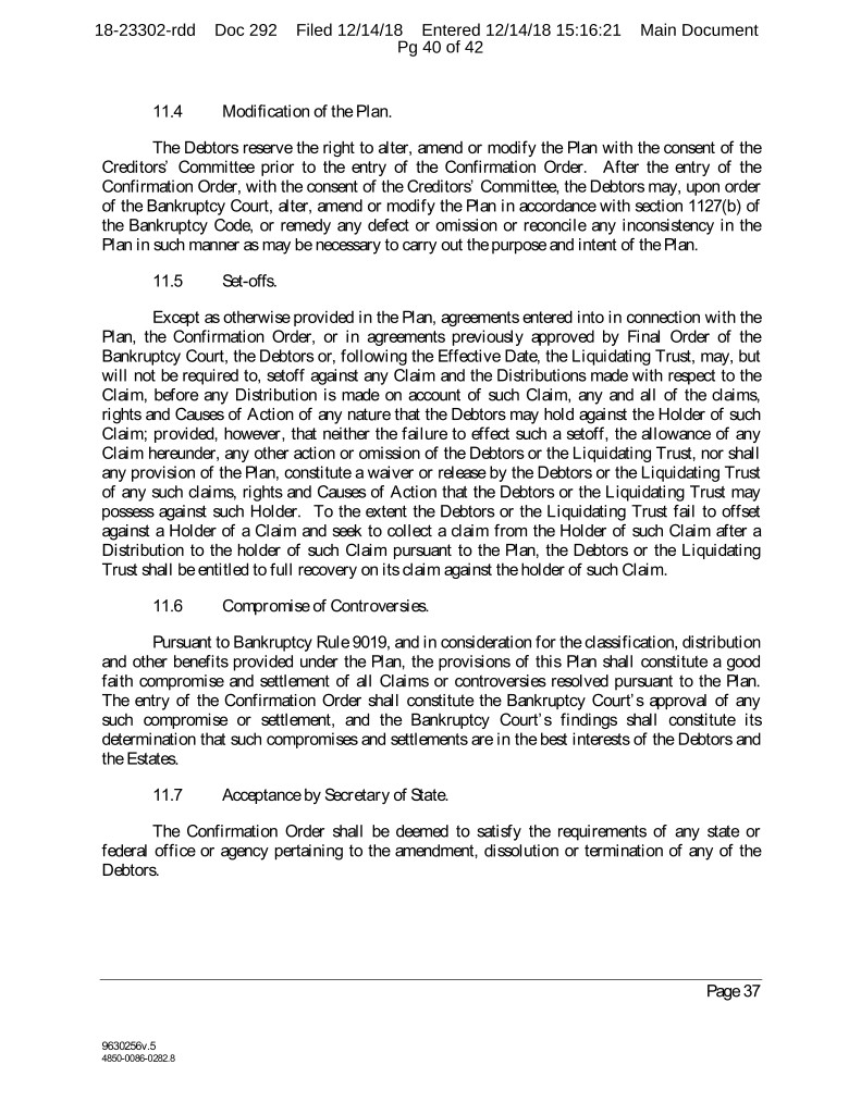 18-23302-rdd Doc 292 Filed 12/14/18 Entered 12/14/18 15:16:21 Main Document Pg 40 of 42 11.4 Modification of the Plan. The Debtors reserve the right to alter, amend or modify the Plan with the consent of the Creditors’ Committee prior to the entry of the Confirmation Order. After the entry of the Confirmation Order, with the consent of the Creditors’ Committee, the Debtors may, upon order of the Bankruptcy Court, alter, amend or modify the Plan in accordance with section 1127(b) of the Bankruptcy Code, or remedy any defect or omission or reconcile any inconsistency in the Plan in such manner as may be necessary to carry out the purpose and intent of the Plan. 11.5 Set-offs. Except as otherwise provided in the Plan, agreements entered into in connection with the Plan, the Confirmation Order, or in agreements previously approved by Final Order of the Bankruptcy Court, the Debtors or, following the Effective Date, the Liquidating Trust, may, but will not be required to, setoff against any Claim and the Distributions made with respect to the Claim, before any Distribution is made on account of such Claim, any and all of the claims, rights and Causes of Action of any nature that the Debtors may hold against the Holder of such Claim; provided, however, that neither the failure to effect such a setoff, the allowance of any Claim hereunder, any other action or omission of the Debtors or the Liquidating Trust, nor shall any provision of the Plan, constitute a waiver or release by the Debtors or the Liquidating Trust of any such claims, rights and Causes of Action that the Debtors or the Liquidating Trust may possess against such Holder. To the extent the Debtors or the Liquidating Trust fail to offset against a Holder of a Claim and seek to collect a claim from the Holder of such Claim after a Distribution to the holder of such Claim pursuant to the Plan, the Debtors or the Liquidating Trust shall be entitled to full recovery on its claim against the holder of such Claim. 11.6 Compromise of Controversies. Pursuant to Bankruptcy Rule 9019, and in consideration for the classification, distribution and other benefits provided under the Plan, the provisions of this Plan shall constitute a good faith compromise and settlement of all Claims or controversies resolved pursuant to the Plan. The entry of the Confirmation Order shall constitute the Bankruptcy Court’s approval of any such compromise or settlement, and the Bankruptcy Court’s findings shall constitute its determination that such compromises and settlements are in the best interests of the Debtors and the Estates. 11.7 Acceptance by Secretary of State. The Confirmation Order shall be deemed to satisfy the requirements of any state or federal office or agency pertaining to the amendment, dissolution or termination of any of the Debtors. Page 37 9630256v.5 4850-0086-0282.8