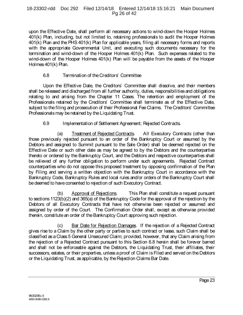 18-23302-rdd Doc 292 Filed 12/14/18 Entered 12/14/18 15:16:21 Main Document Pg 26 of 42 upon the Effective Date, shall perform all necessary actions to wind-down the Hooper Holmes 401(k) Plan, including, but not limited to, retaining professionals to audit the Hooper Holmes 401(k) Plan and the PHS 401(k) Plan for applicable years, filing all necessary forms and reports with the appropriate Governmental Unit, and executing such documents necessary for the termination and wind-down of the Hooper Holmes 401(k) Plan. Such expenses related to the wind-down of the Hooper Holmes 401(k) Plan will be payable from the assets of the Hooper Holmes 401(k) Plan. 6.8 Termination of the Creditors’ Committee Upon the Effective Date, the Creditors’ Committee shall dissolve, and their members shall be released and discharged from all further authority, duties, responsibilities and obligations relating to and arising from the Chapter 11 Cases. The retention and employment of the Professionals retained by the Creditors’ Committee shall terminate as of the Effective Date, subject to the filing and prosecution of their Professional Fee Claims. The Creditors’ Committee Professionals may be retained by the Liquidating Trust. 6.9 Implementation of Settlement Agreement; Rejected Contracts. (a) Treatment of Rejected Contracts. All Executory Contracts (other than those previously rejected pursuant to an order of the Bankruptcy Court or assumed by the Debtors and assigned to Summit pursuant to the Sale Order) shall be deemed rejected on the Effective Date or such other date as may be agreed to by the Debtors and the counterparties thereto or ordered by the Bankruptcy Court, and the Debtors and respective counterparties shall be relieved of any further obligation to perform under such agreements. Rejected Contract counterparties who do not oppose this proposed treatment by opposing confirmation of the Plan by Filing and serving a written objection with the Bankruptcy Court in accordance with the Bankruptcy Code, Bankruptcy Rules and local rules and/or orders of the Bankruptcy Court shall be deemed to have consented to rejection of such Executory Contract. (b) Approval of Rejections. This Plan shall constitute a request pursuant to sections 1123(b)(2) and 365(a) of the Bankruptcy Code for the approval of the rejection by the Debtors of all Executory Contracts that have not otherwise been rejected or assumed and assigned by order of the Court. The Confirmation Order shall, except as otherwise provided therein, constitute an order of the Bankruptcy Court approving such rejection. (c) Bar Date for Rejection Damages. If the rejection of a Rejected Contract gives rise to a Claim by the other party or parties to such contract or lease, such Claim shall be classified as a Class 5 General Unsecured Claim; provided, however, that any Claim arising from the rejection of a Rejected Contract pursuant to this Section 6.8 herein shall be forever barred and shall not be enforceable against the Debtors, the Liquidating Trust, their affiliates, their successors, estates, or their properties, unless a proof of Claim is Filed and served on the Debtors or the Liquidating Trust, as applicable, by the Rejection Claims Bar Date. Page 23 9630256v.5 4850-0086-0282.8