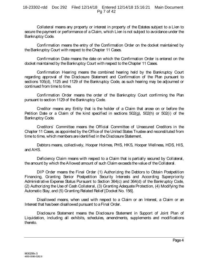 18-23302-rdd Doc 292 Filed 12/14/18 Entered 12/14/18 15:16:21 Main Document Pg 7 of 42 Collateral means any property or interest in property of the Estates subject to a Lien to secure the payment or performance of a Claim, which Lien is not subject to avoidance under the Bankruptcy Code. Confirmation means the entry of the Confirmation Order on the docket maintained by the Bankruptcy Court with respect to the Chapter 11 Cases. Confirmation Date means the date on which the Confirmation Order is entered on the docket maintained by the Bankruptcy Court with respect to the Chapter 11 Cases. Confirmation Hearing means the combined hearing held by the Bankruptcy Court regarding approval of the Disclosure Statement and Confirmation of the Plan pursuant to sections 105(d), 1125 and 1129 of the Bankruptcy Code, as such hearing may be adjourned or continued from time to time. Confirmation Order means the order of the Bankruptcy Court confirming the Plan pursuant to section 1129 of the Bankruptcy Code. Creditor means any Entity that is the holder of a Claim that arose on or before the Petition Date or a Claim of the kind specified in sections 502(g), 502(h) or 502(i) of the Bankruptcy Code. Creditors’ Committee means the Official Committee of Unsecured Creditors in the Chapter 11 Cases, as appointed by the Office of the United States Trustee and reconstituted from time to time, which members are identified in the Disclosure Statement. Debtors means, collectively, Hooper Holmes, PHS, HKS, Hooper Wellness, HDS, HIS, and AHS. Deficiency Claim means with respect to a Claim that is partially secured by Collateral, the amount by which the Allowed amount of such Claim exceeds the value of the Collateral. DIP Order means the Final Order (1) Authorizing the Debtors to Obtain Postpetition Financing, Granting Senior Postpetition Security Interests and According Superpriority Administrative Expense Status Pursuant to Section 364(c) and 364(d) of the Bankruptcy Code, (2) Authorizing the Use of Cash Collateral, (3) Granting Adequate Protection, (4) Modifying the Automatic Stay, and (5) Granting Related Relief [Docket No. 156]. Disallowed means, when used with respect to a Claim or an Interest, a Claim or an Interest that has been disallowed pursuant to a Final Order. Disclosure Statement means the Disclosure Statement in Support of Joint Plan of Liquidation, including all exhibits, schedules, amendments, supplements and modifications thereto. Page 4 9630256v.5 4850-0086-0282.8
