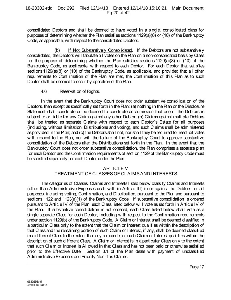 18-23302-rdd Doc 292 Filed 12/14/18 Entered 12/14/18 15:16:21 Main Document Pg 20 of 42 consolidated Debtors and shall be deemed to have voted in a single, consolidated class for purposes of determining whether the Plan satisfies sections 1129(a)(8) or (10) of the Bankruptcy Code, as applicable, with respect to the consolidated Debtors. (b) If Not Substantively Consolidated. If the Debtors are not substantively consolidated, the Debtors will tabulate all votes on the Plan on a non-consolidated basis by Class for the purpose of determining whether the Plan satisfies sections 1129(a)(8) or (10) of the Bankruptcy Code, as applicable, with respect to each Debtor. For each Debtor that satisfies sections 1129(a)(8) or (10) of the Bankruptcy Code, as applicable, and provided that all other requirements to Confirmation of the Plan are met, the Confirmation of this Plan as to such Debtor shall be deemed to occur by operation of the Plan. 4.6 Reservation of Rights. In the event that the Bankruptcy Court does not order substantive consolidation of the Debtors, then except as specifically set forth in the Plan: (a) nothing in the Plan or the Disclosure Statement shall constitute or be deemed to constitute an admission that one of the Debtors is subject to or liable for any Claim against any other Debtor; (b) Claims against multiple Debtors shall be treated as separate Claims with respect to each Debtor’s Estate for all purposes (including, without limitation, Distributions and voting), and such Claims shall be administered as provided in the Plan; and (c) the Debtors shall not, nor shall they be required to, resolicit votes with respect to the Plan, nor will the failure of the Bankruptcy Court to approve substantive consolidation of the Debtors alter the Distributions set forth in the Plan. In the event that the Bankruptcy Court does not order substantive consolidation, the Plan comprises a separate plan for each Debtor and the Confirmation requirements of section 1129 of the Bankruptcy Code must be satisfied separately for each Debtor under the Plan. ARTICLE V TREATMENT OF CLASSES OF CLAIMS AND INTERESTS The categories of Classes, Claims and Interests listed below classify Claims and Interests (other than Administrative Expenses dealt with in Article III) in or against the Debtors for all purposes, including voting, Confirmation, and Distribution, pursuant to the Plan and pursuant to sections 1122 and 1123(a)(1) of the Bankruptcy Code. If substantive consolidation is ordered pursuant to Article IV of the Plan, each Class listed below will vote as set forth in Article IV of the Plan. If substantive consolidation is not ordered, each Class listed below shall vote as a single separate Class for each Debtor, including with respect to the Confirmation requirements under section 1129(b) of the Bankruptcy Code. A Claim or Interest shall be deemed classified in a particular Class only to the extent that the Claim or Interest qualifies within the description of that Class and the remaining portion of such Claim or Interest, if any, shall be deemed classified in a different Class to the extent that any remainder of such Claim or Interest qualifies within the description of such different Class. A Claim or Interest is in a particular Class only to the extent that such Claim or Interest is Allowed in that Class and has not been paid or otherwise satisfied prior to the Effective Date. Section 3.1 of the Plan deals with payment of unclassified Administrative Expenses and Priority Non-Tax Claims. Page 17 9630256v.5 4850-0086-0282.8