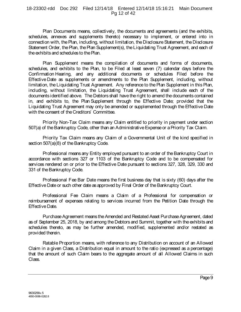 18-23302-rdd Doc 292 Filed 12/14/18 Entered 12/14/18 15:16:21 Main Document Pg 12 of 42 Plan Documents means, collectively, the documents and agreements (and the exhibits, schedules, annexes and supplements thereto) necessary to implement, or entered into in connection with, the Plan, including, without limitation, the Disclosure Statement, the Disclosure Statement Order, the Plan, the Plan Supplement(s), the Liquidating Trust Agreement, and each of the exhibits and schedules to the Plan. Plan Supplement means the compilation of documents and forms of documents, schedules, and exhibits to the Plan, to be Filed at least seven (7) calendar days before the Confirmation Hearing, and any additional documents or schedules Filed before the Effective Date as supplements or amendments to the Plan Supplement, including, without limitation, the Liquidating Trust Agreement. Any reference to the Plan Supplement in this Plan, including, without limitation, the Liquidating Trust Agreement, shall include each of the documents identified above. The Debtors shall have the right to amend the documents contained in, and exhibits to, the Plan Supplement through the Effective Date; provided that the Liquidating Trust Agreement may only be amended or supplemented through the Effective Date with the consent of the Creditors’ Committee. Priority Non-Tax Claim means any Claim entitled to priority in payment under section 507(a) of the Bankruptcy Code, other than an Administrative Expense or a Priority Tax Claim. Priority Tax Claim means any Claim of a Governmental Unit of the kind specified in section 507(a)(8) of the Bankruptcy Code. Professional means any Entity employed pursuant to an order of the Bankruptcy Court in accordance with sections 327 or 1103 of the Bankruptcy Code and to be compensated for services rendered on or prior to the Effective Date pursuant to sections 327, 328, 329, 330 and 331 of the Bankruptcy Code. Professional Fee Bar Date means the first business day that is sixty (60) days after the Effective Date or such other date as approved by Final Order of the Bankruptcy Court. Professional Fee Claim means a Claim of a Professional for compensation or reimbursement of expenses relating to services incurred from the Petition Date through the Effective Date. Purchase Agreement means the Amended and Restated Asset Purchase Agreement, dated as of September 25, 2018, by and among the Debtors and Summit, together with the exhibits and schedules thereto, as may be further amended, modified, supplemented and/or restated as provided therein. Ratable Proportion means, with reference to any Distribution on account of an Allowed Claim in a given Class, a Distribution equal in amount to the ratio (expressed as a percentage) that the amount of such Claim bears to the aggregate amount of all Allowed Claims in such Class. Page 9 9630256v.5 4850-0086-0282.8